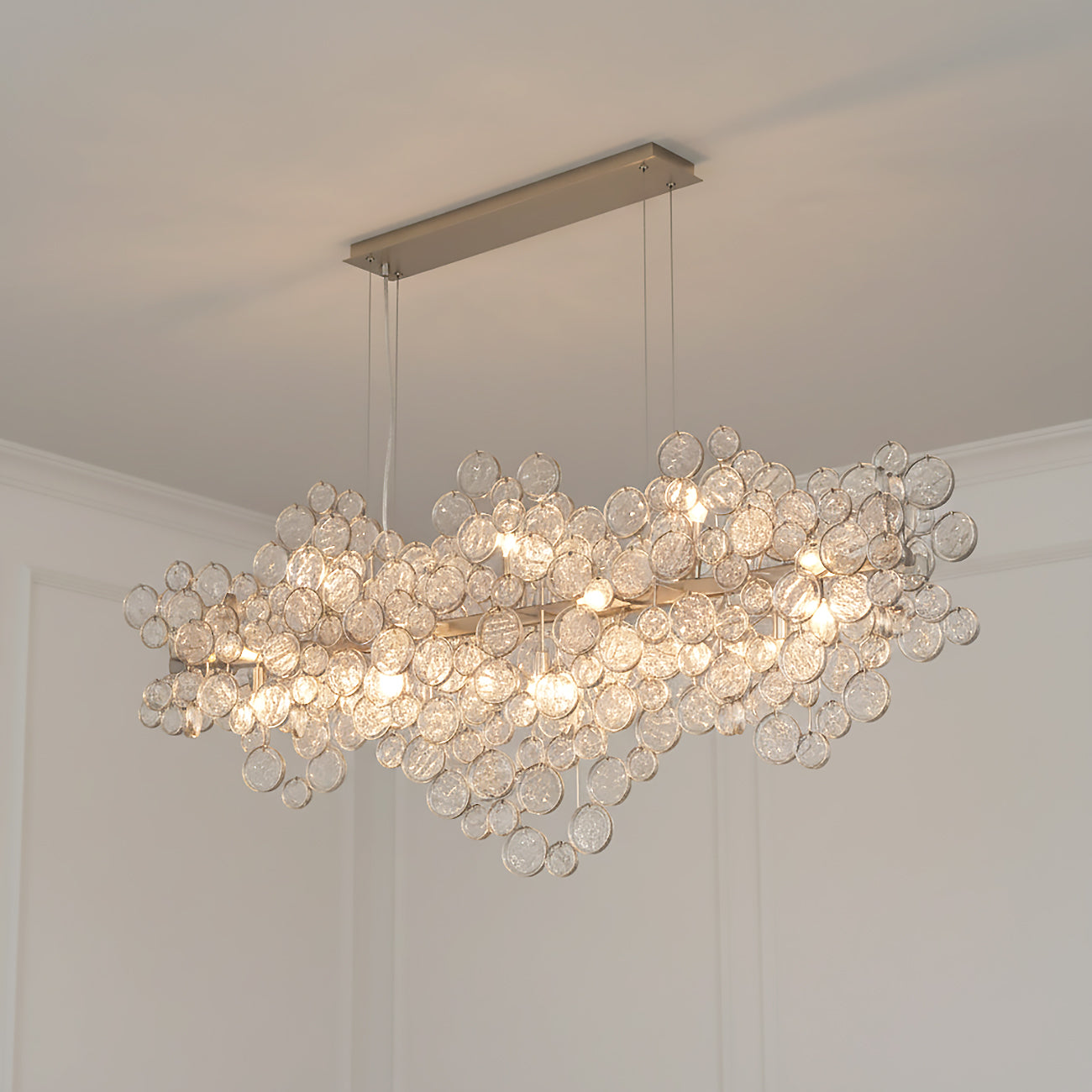 The Denali 15 Light Linear Chandelier brings dramatic luxury to any space with its stunning cluster disc design and champagne silver finish. This captivating fixture features multiple beautifully crafted clear, textured glass shades arranged in an artful linear composition, creating brilliant crystal-like illumination that transforms dining rooms, kitchen islands, and entertaining spaces into sophisticated gathering places. The textured glass elements capture and amplify light, delivering a magnificent glow that serves as a brilliant focal point for social spaces. The champagne silver framework and sparkling clear glass deliver contemporary luxury with timeless sophistication. At 56" in length with its distinctive clustered arrangement, this chandelier makes an unforgettable centerpiece that elevates any room with crystal elegance.