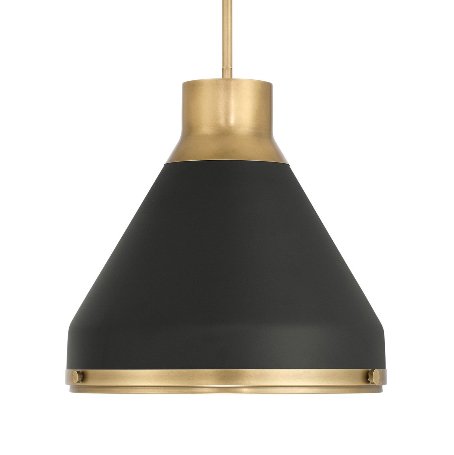 • Drew pendant features a bold and modern conical design that utilizes Aged Brass detailing to add warmth and architectural depth to the Matte Black finish
