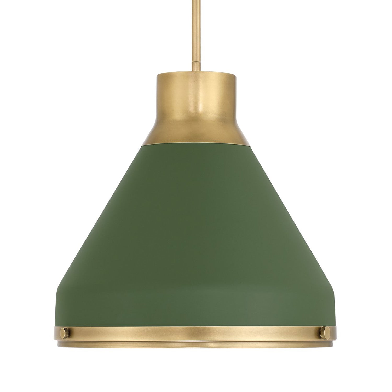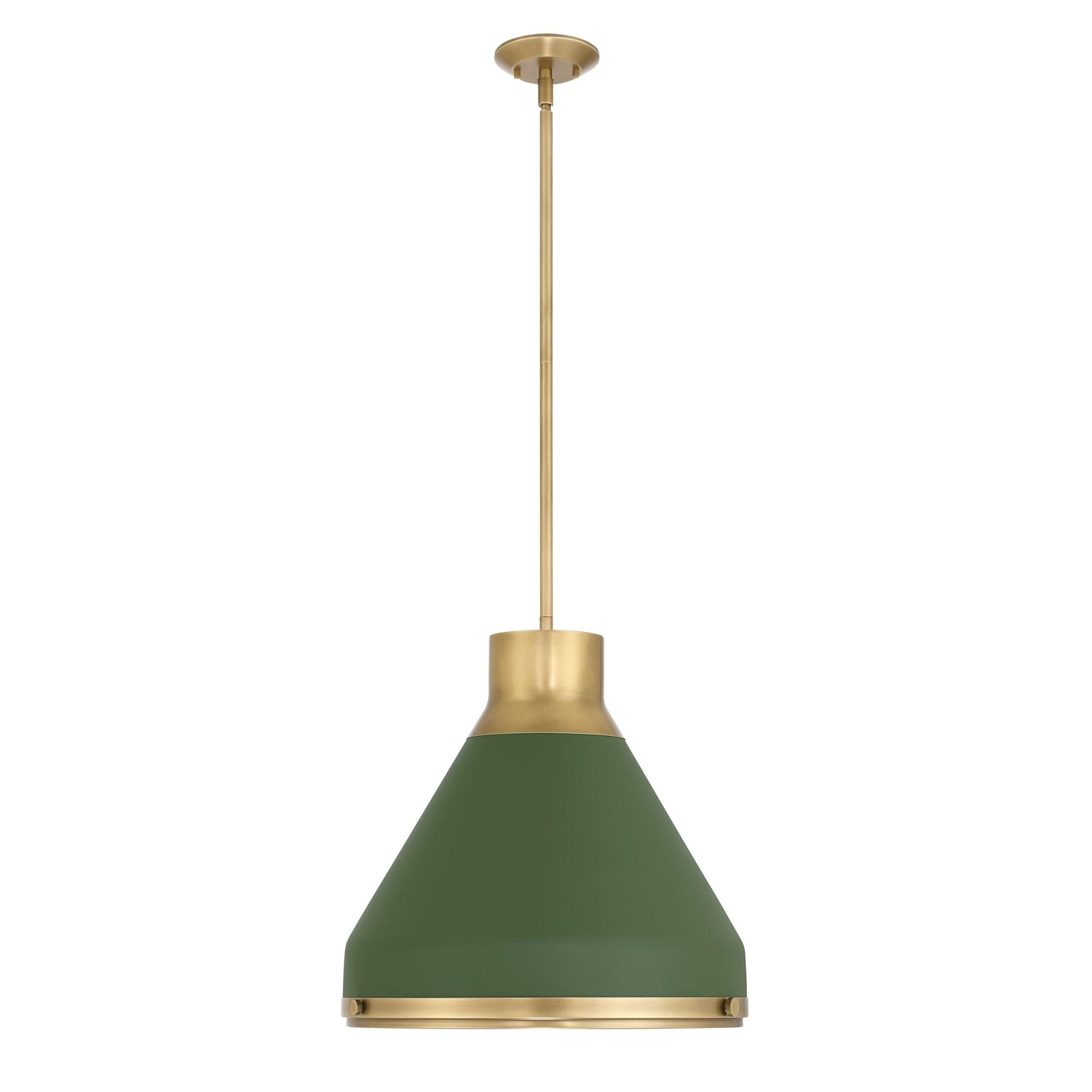 • Drew pendant features a bold and modern conical design that utilizes Aged Brass detailing to add warmth and architectural depth to the Olive Green finish