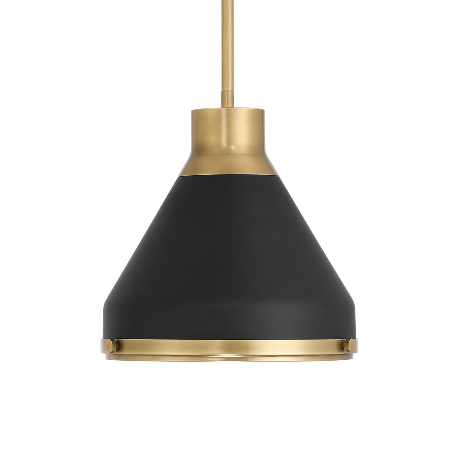 • Drew pendant features a bold and modern conical design that utilizes Aged Brass detailing to add warmth and architectural depth to the Matte Black finish