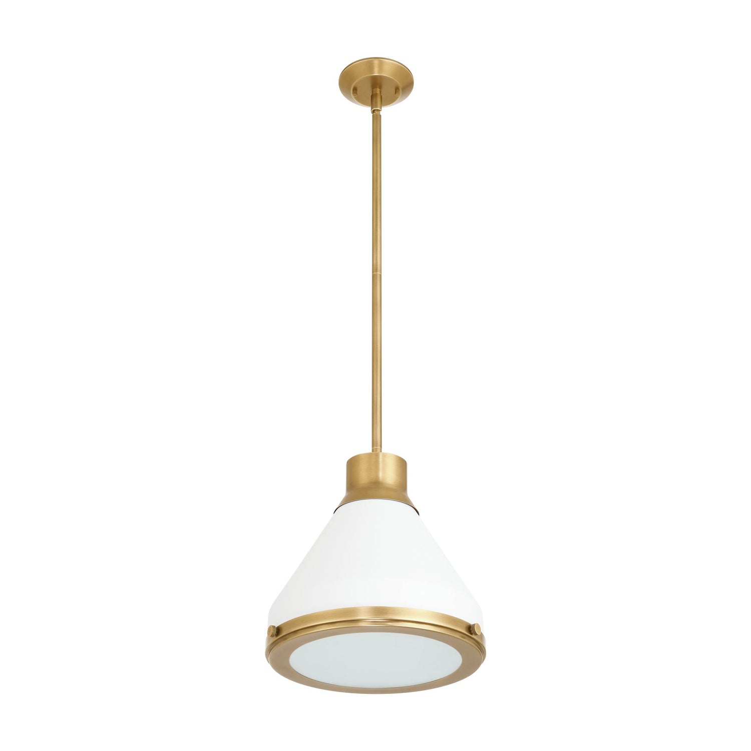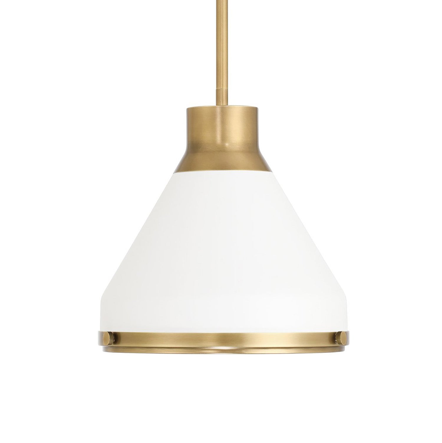 • Drew pendant features a bold and modern conical design that utilizes Aged Brass detailing to add warmth and architectural depth to the Matte White finish