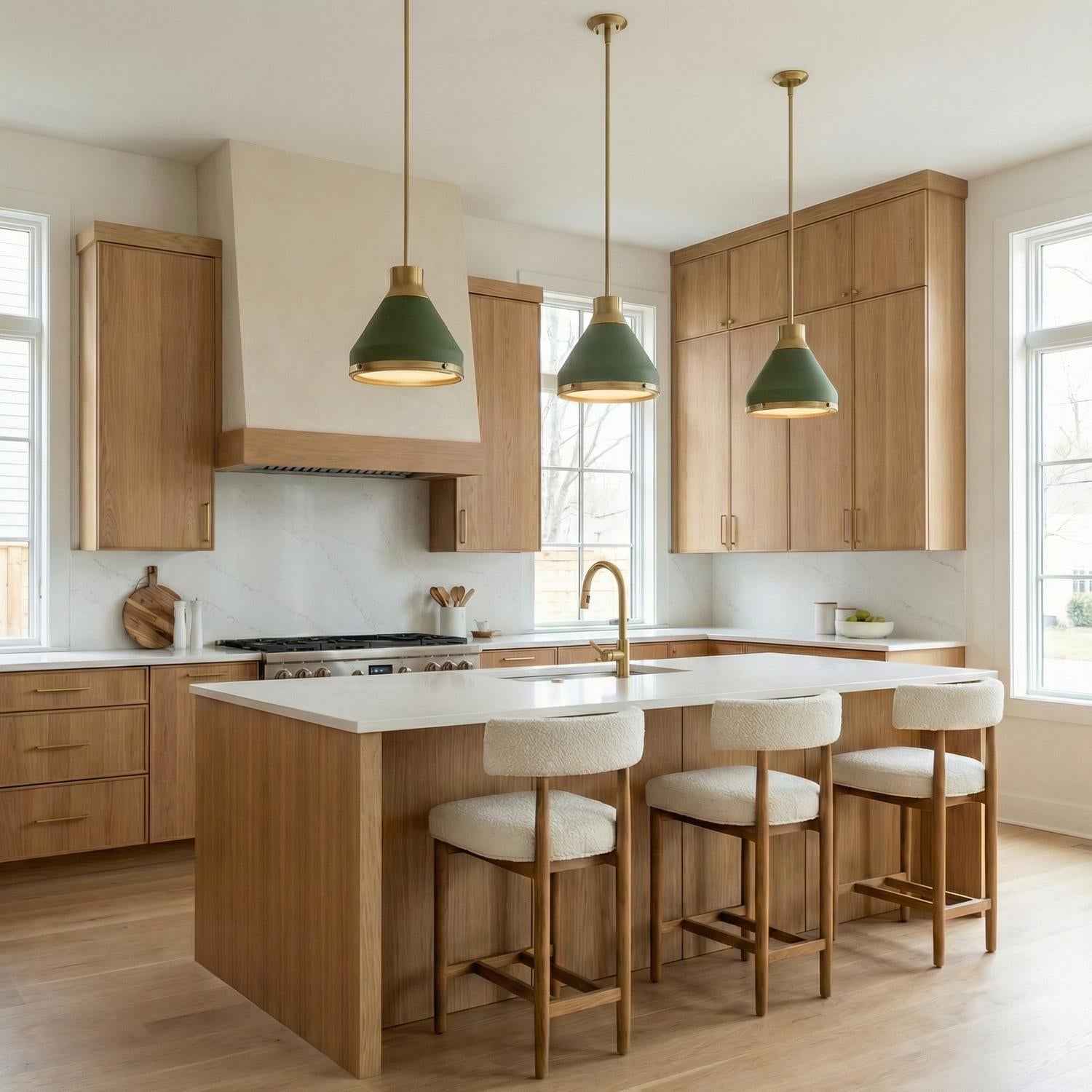 The Drew Small Pendant 13", Olive Green and Aged Brass transforms a simple architectural silhouette into a striking design centerpiece for contemporary interiors. Its bold presence is defined by a conical steel shade, available in an earthy Olive Green finish that is beautifully enriched by Aged Brass detailing. These warm metallic accents add significant depth and a touch of mid-century flair to the fixture's profile. To ensure a comfortable atmosphere, an etched glass diffuser is integrated into the base of the shade to soften the light and eliminate glare. This pendant is an exceptional choice for illuminating kitchen islands, breakfast nooks, or modern entryways where a blend of focused task lighting and refined style is required.