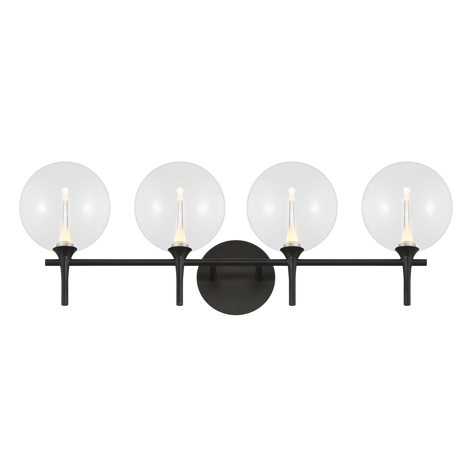 • Sleek linear design with matte black finish featuring four clear glass globes for enhanced, brilliant task illumination