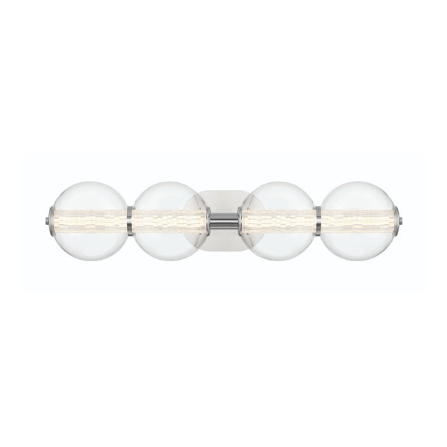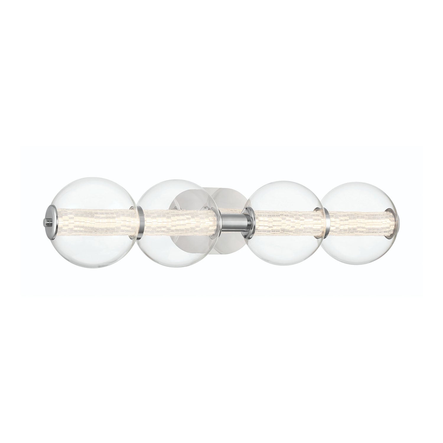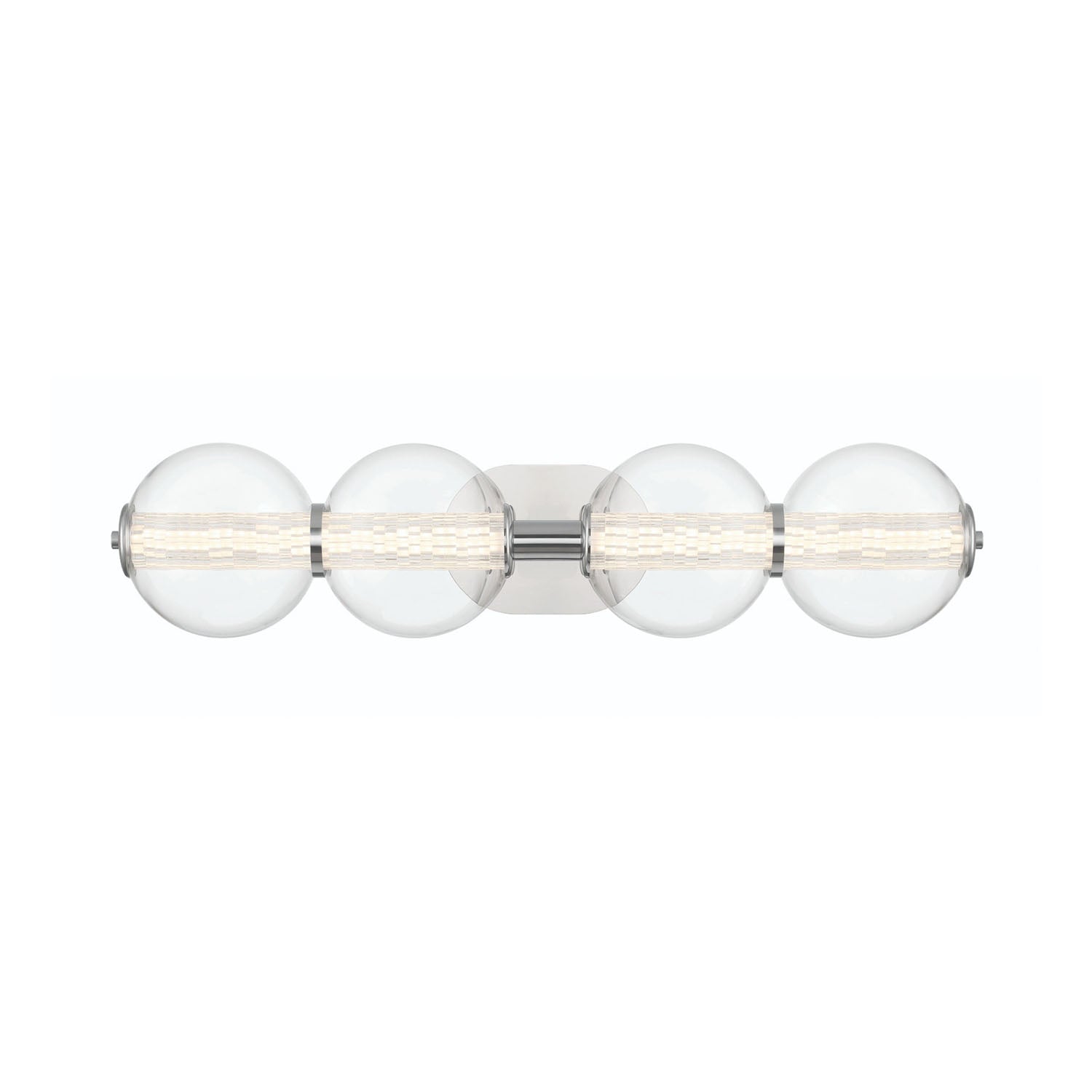 The Elara LED Vanity brings sculptural elegance to any bathroom with its striking sphere design and polished chrome finish. This captivating fixture features four perfectly proportioned clear glass spheres mounted along a sleek chrome framework, each housing LEDs surrounded by crystal details that create brilliant, multi-directional illumination and spectacular light refraction for professional-quality task lighting. The polished chrome and crystal-enhanced clear glass elements deliver contemporary artistry at its finest. At 30" wide with integrated LED technology, this vanity light makes a stunning focal point while providing decades of energy-efficient operation.