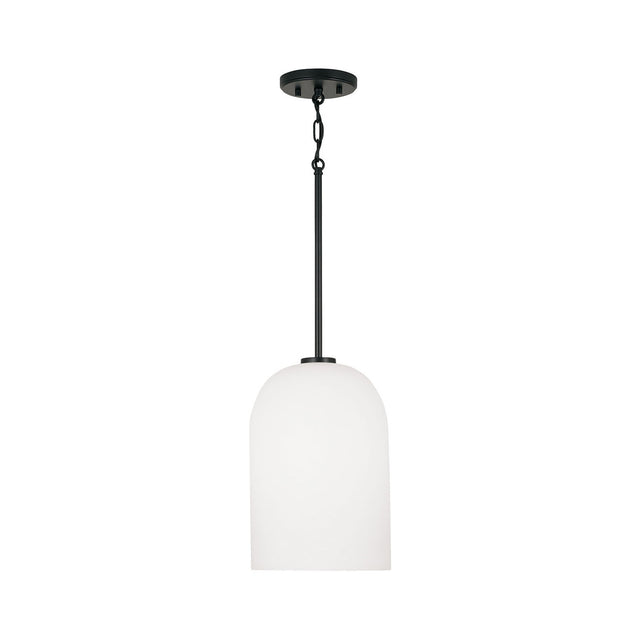 • Classic design with matte black finish featuring an elegant stem and an opal glass dome shade