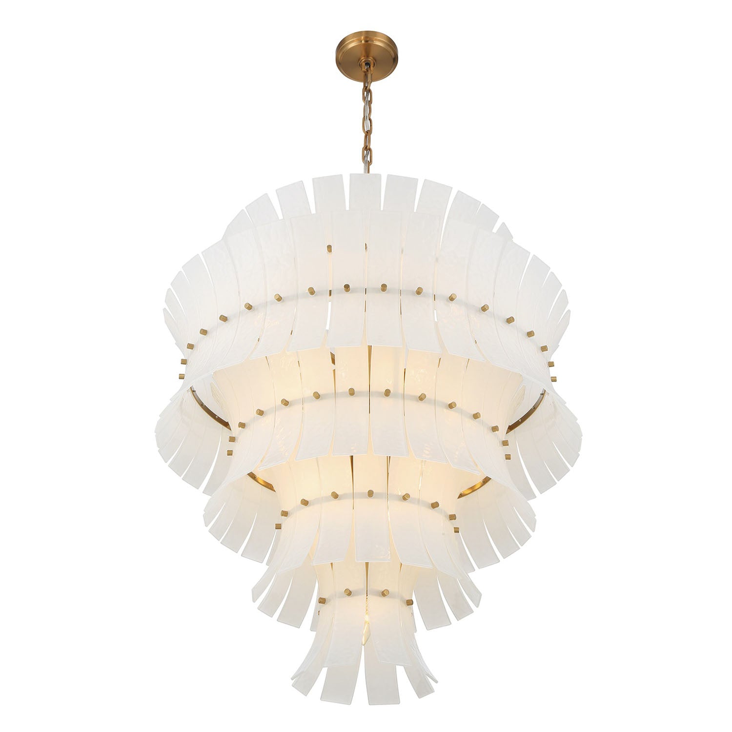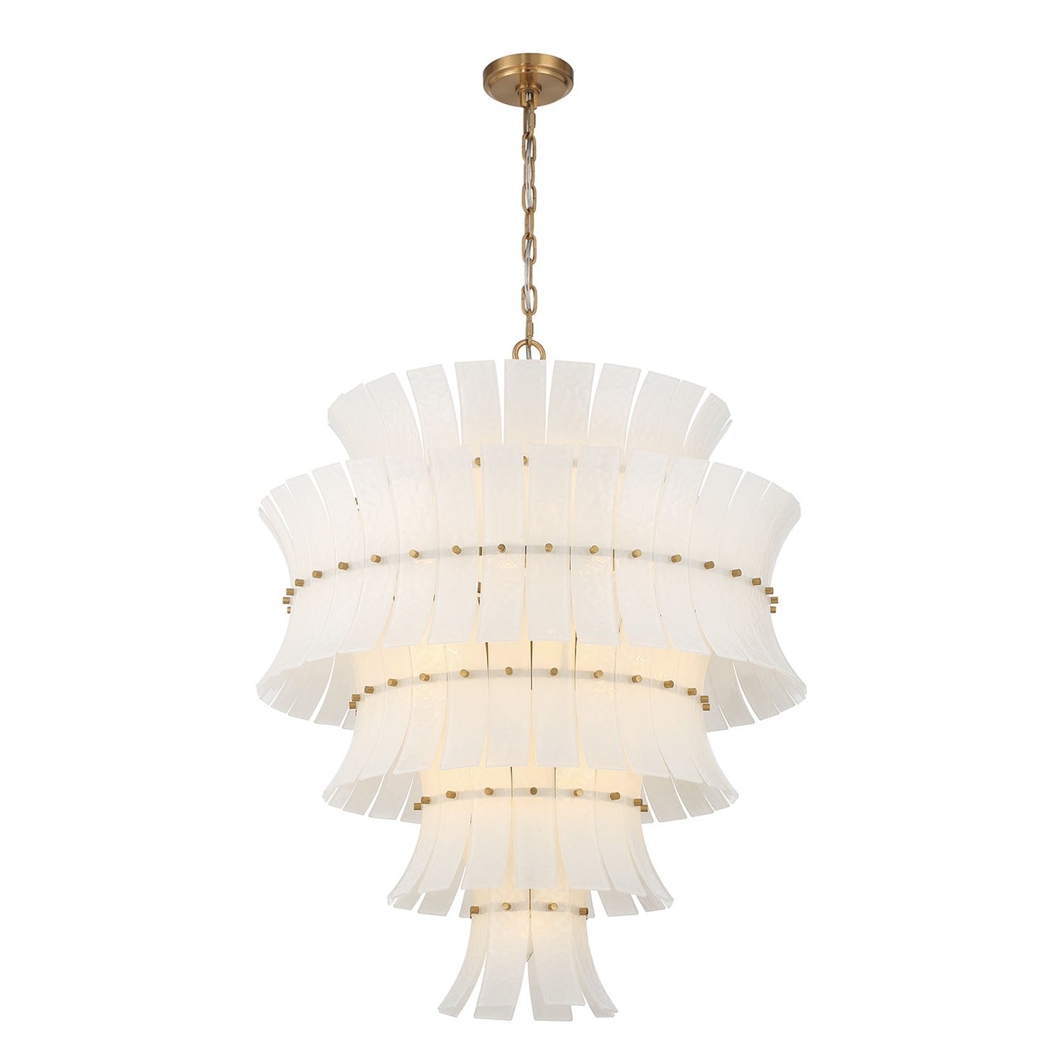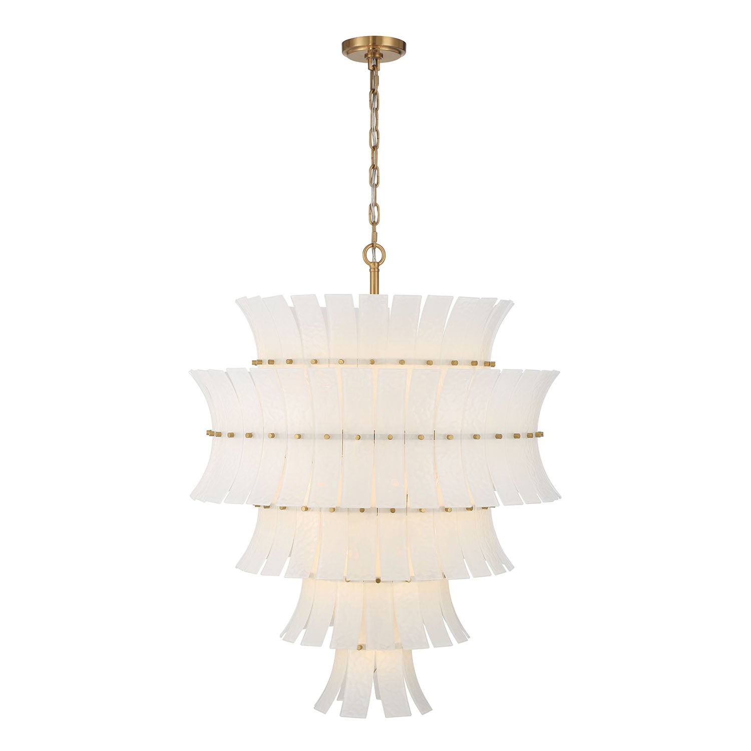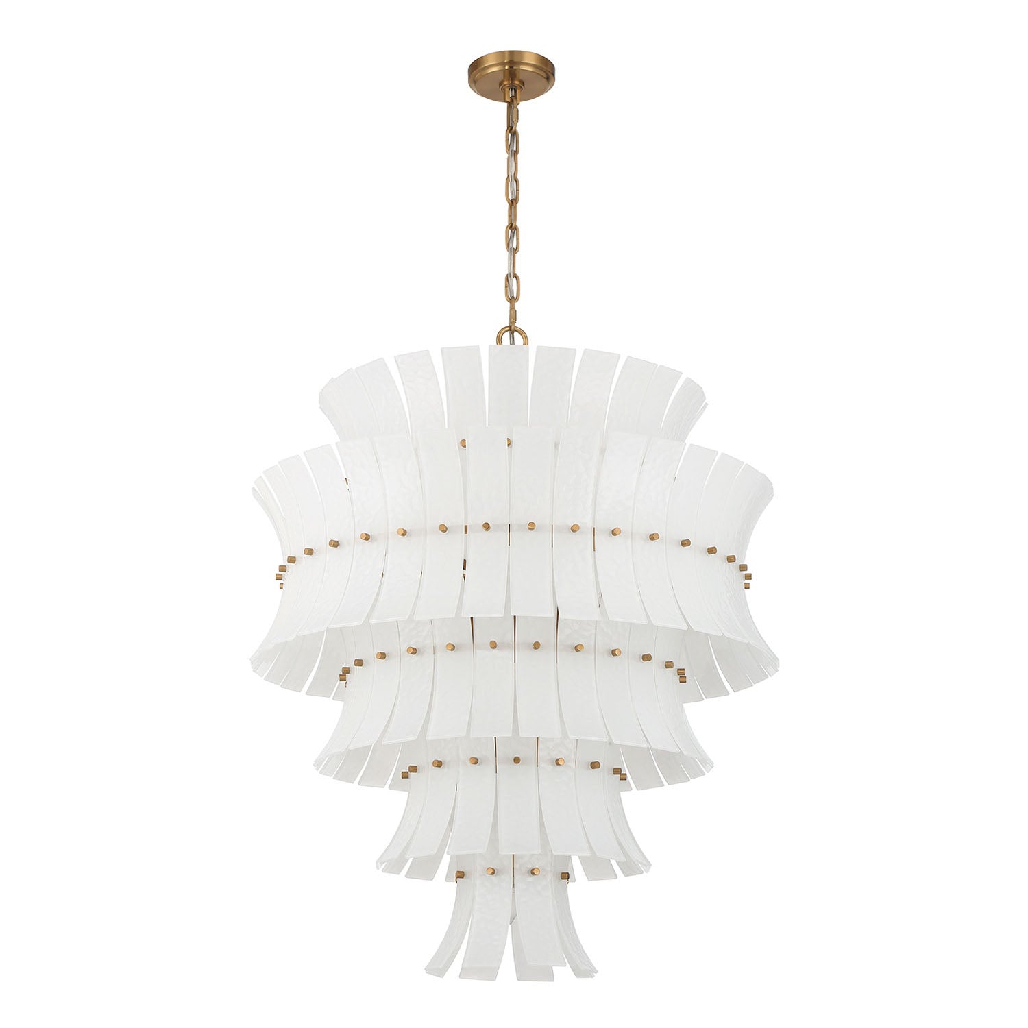 • Multi-tiered glass design with expansive cascading layers of curved, white art glass arranged in a tiered formation, supported by aged brass framework