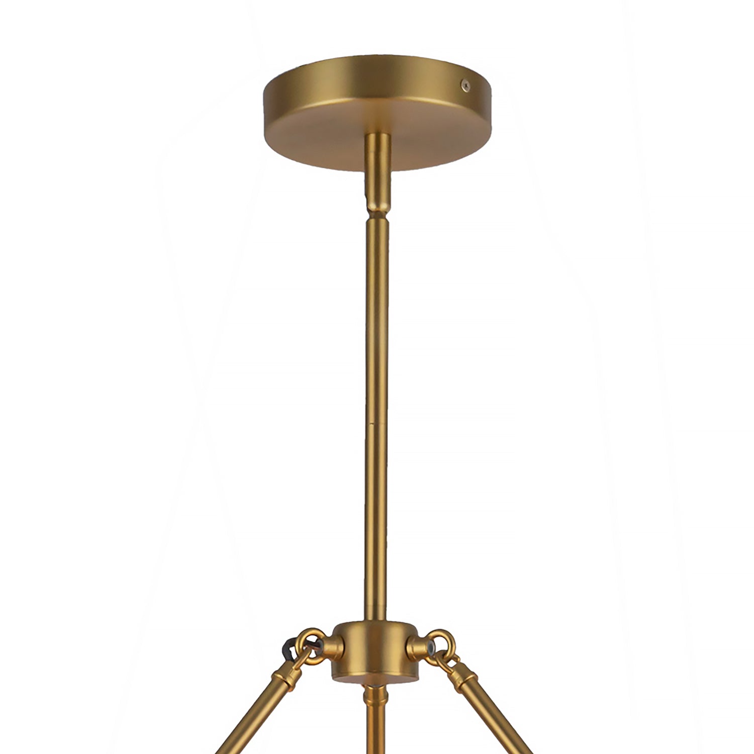 • Round chandelier features reeded milk glass shades with Brushed Brass hardware