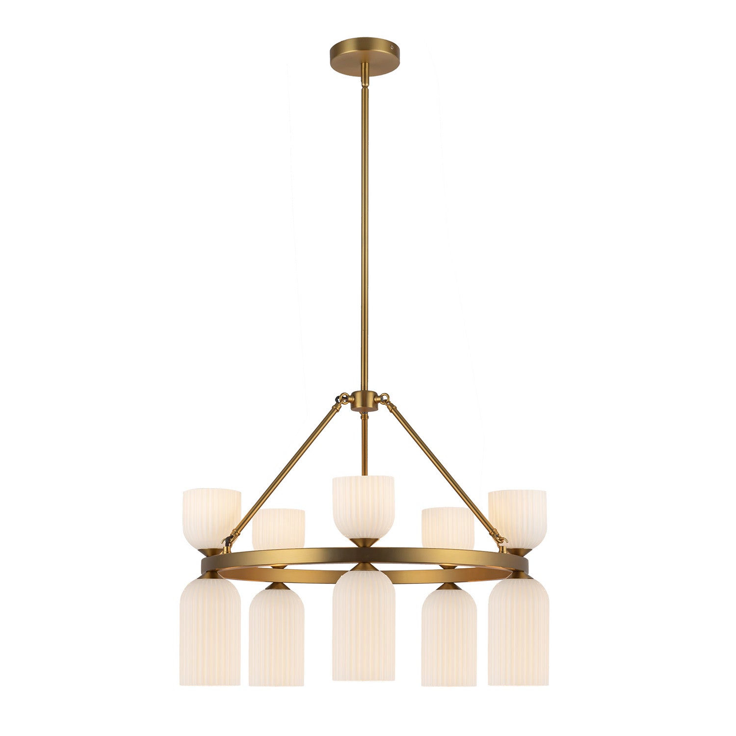 The Elle Chandelier features a striking two-tier design with reeded milk glass shades, arranged in a circular formation, on a Brushed Brass frame. This elegant fixture showcases fluted cylindrical glass elements that diffuse light evenly for a soft, inviting glow. The upper tier displays five upward-facing shades while the lower tier presents five downward-facing shades, all supported by slender brass arms. Measuring nearly 26" in diameter, the Elle makes a dramatic statement over dining tables, in foyers, or in spacious living areas. The combination of translucent fluted glass and warm brass hardware brings a contemporary yet timeless aesthetic to your space.