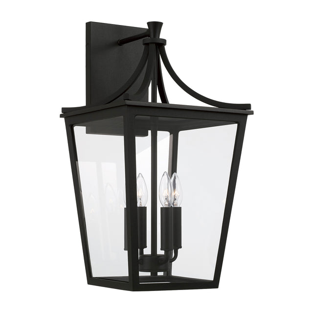 • Sculptural matte black metal lantern design with curved supports and clear glass side panels