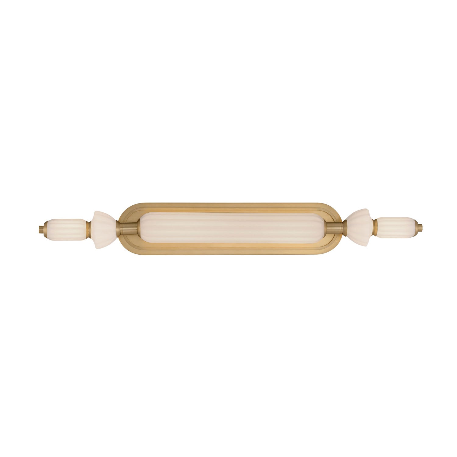 The Giselle LED Vanity brings contemporary chic to any bathroom with its sleek linear profile and sophisticated brass framing. This striking fixture features a beautifully proportioned polished nickel structure that elegantly houses a ribbed opal glass diffuser, creating smooth, luxurious illumination that transforms daily routines while adding modern sophistication to vanity spaces. The brass finish combined with the flowing opal glass delivers polished elegance, perfect for contemporary bathrooms that demand both style and performance. At 31" wide with integrated LED technology, this vanity light makes a refined statement while providing decades of maintenance-free operation.