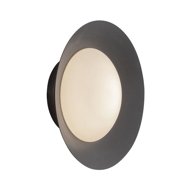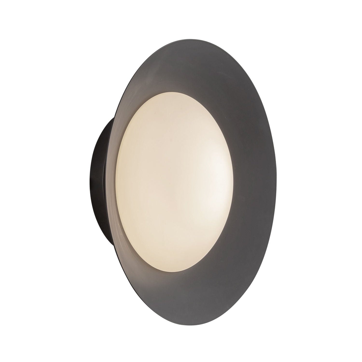 The Elon LED Wall Sconce brings modern elegance to any interior space with its elegant circular design and sleek matte black finish. This refined fixture features an oversized opal glass diffuser beautifully framed by an elegant disc shade that creates stunning visual depth and gentle, diffused illumination. The integrated LED technology provides warm 3000K illumination at 90 CRI through the opal glass, producing exceptional color rendering with energy-efficient performance. At 9" diameter with ADA-compliant design and compact 3" extension, this wall sconce makes an elegant statement that brings timeless design and refined lighting to any interior.