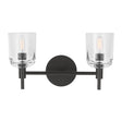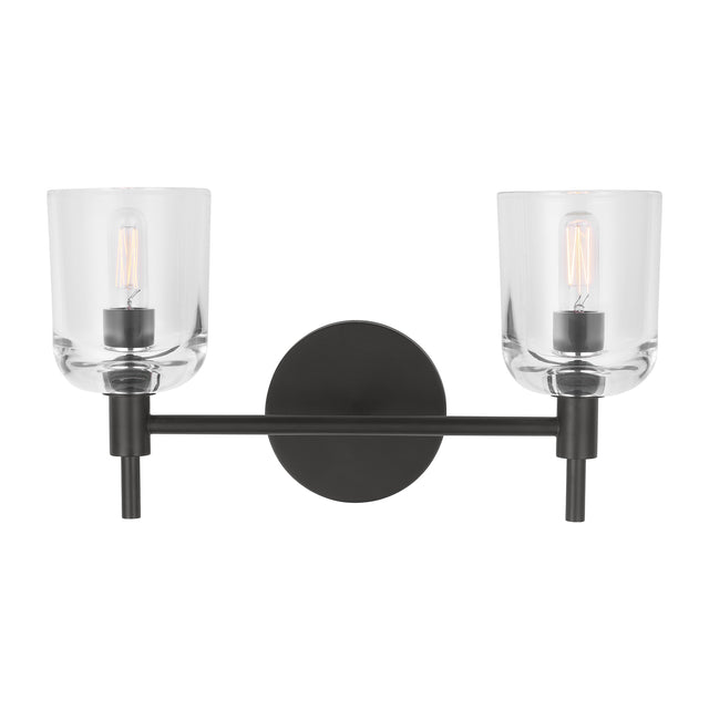 The Emrys 2 Light Vanity exemplifies bold and elegant contrast, reimagining timeless lighting design with a modern edge through its harmonious mix of materials and sculptural presence. This versatile vanity fixture features a thoughtful interplay of curved and linear elements that creates a sophisticated, sculptural silhouette designed to enhance a variety of interiors, perfect for bathrooms, powder rooms, vanity areas, and spaces seeking refined vanity lighting with distinctive character. The aged iron finish creates sophisticated depth while the clear glass shades showcase the bulbs within for distinctive illumination. With its damp-rated construction and striking design, this expertly crafted vanity fixture elevates any space with refined contemporary elegance and enduring appeal.