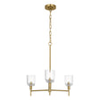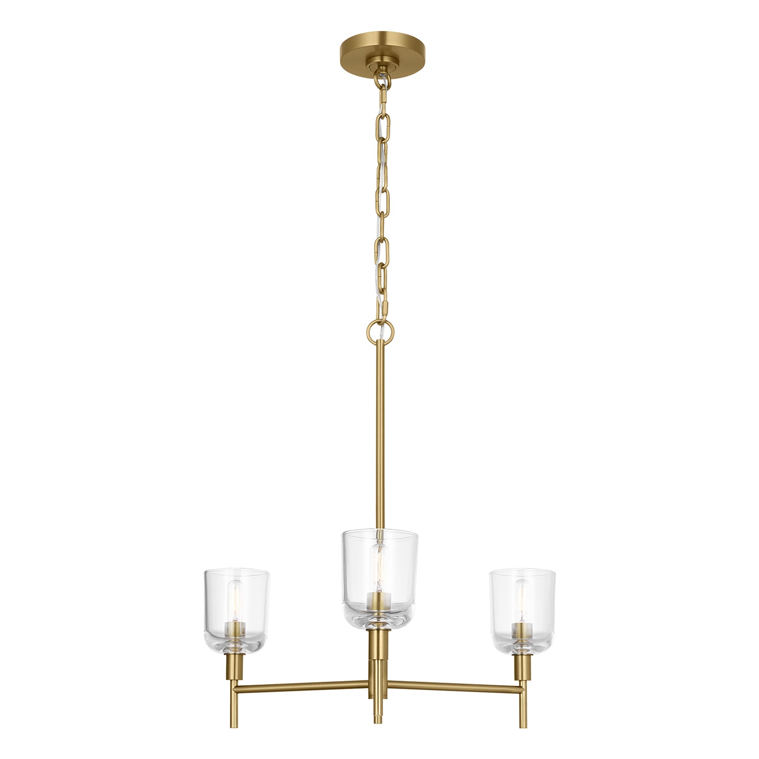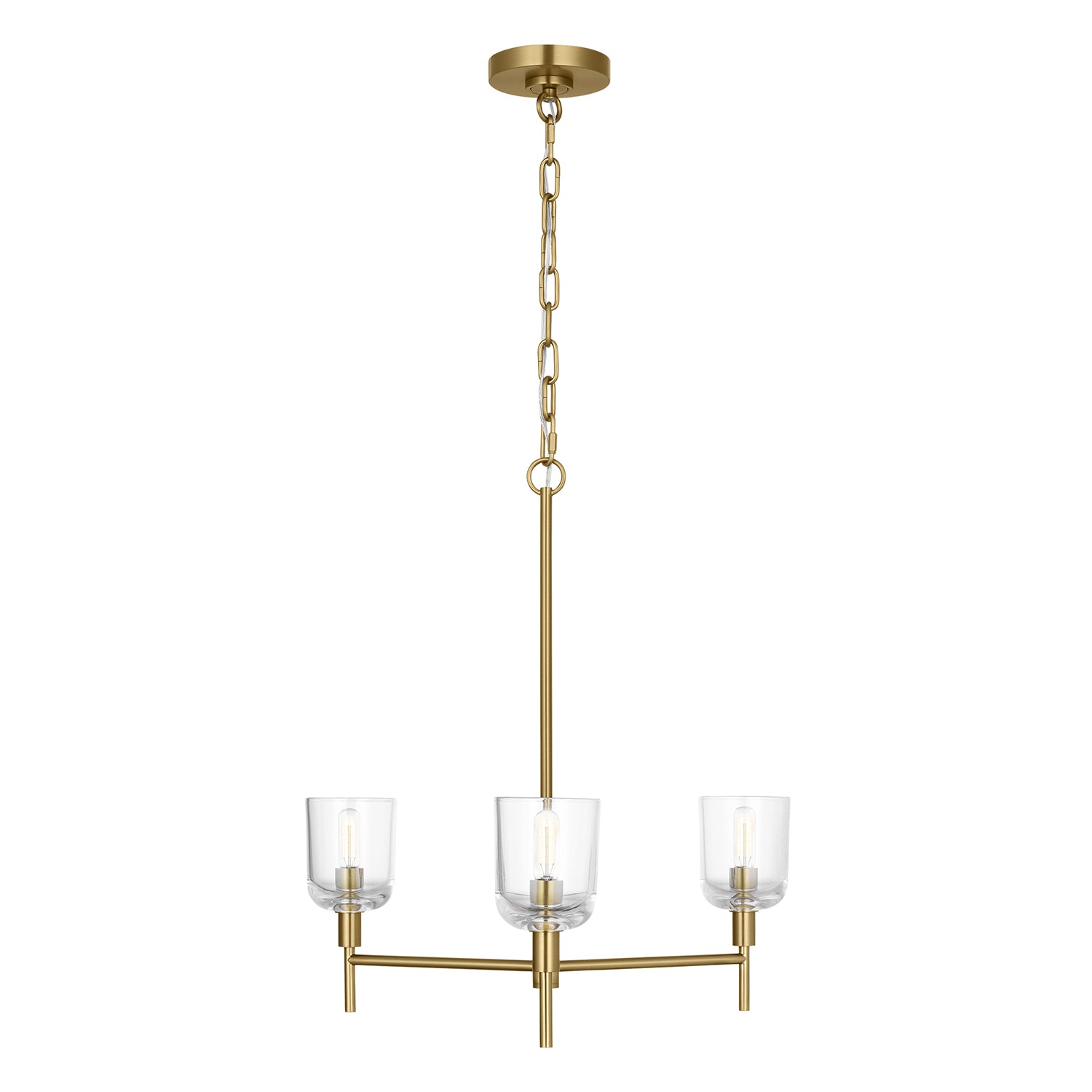 The Emrys 3 Light Chandelier exemplifies bold and elegant contrast, reimagining timeless lighting design with a modern edge through its harmonious mix of materials and sculptural presence. This versatile 24" chandelier features a thoughtful interplay of curved and linear elements that creates a sophisticated, sculptural silhouette designed to enhance a variety of interiors, perfect for dining rooms, entryways, living spaces, foyers, and areas seeking refined chandelier lighting with contemporary style. The modern brass finish brings warm metallic sophistication, while the clear glass shades showcase the bulbs within for distinctive illumination. With its damp-rated construction, substantial hanging range, and striking design, this expertly crafted chandelier elevates any space with refined contemporary elegance and enduring appeal.