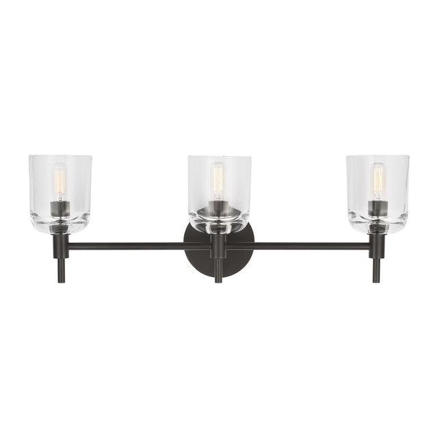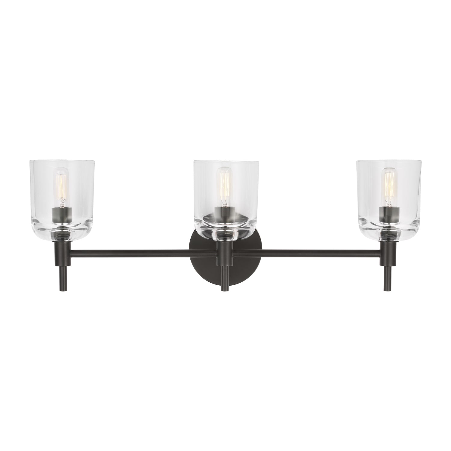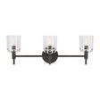The Emrys 3 Light Vanity exemplifies bold and elegant contrast, reimagining timeless lighting design with a modern edge through its harmonious mix of materials and sculptural presence. This versatile vanity fixture features a thoughtful interplay of curved and linear elements that creates a sophisticated, sculptural silhouette designed to enhance a variety of interiors, perfect for bathrooms, powder rooms, vanity areas, and spaces seeking refined vanity lighting with distinctive character. The aged iron finish creates sophisticated depth while the clear glass shades showcase the bulbs within for distinctive illumination. With its damp-rated construction and striking design, this expertly crafted vanity fixture elevates any space with refined contemporary elegance and enduring appeal.