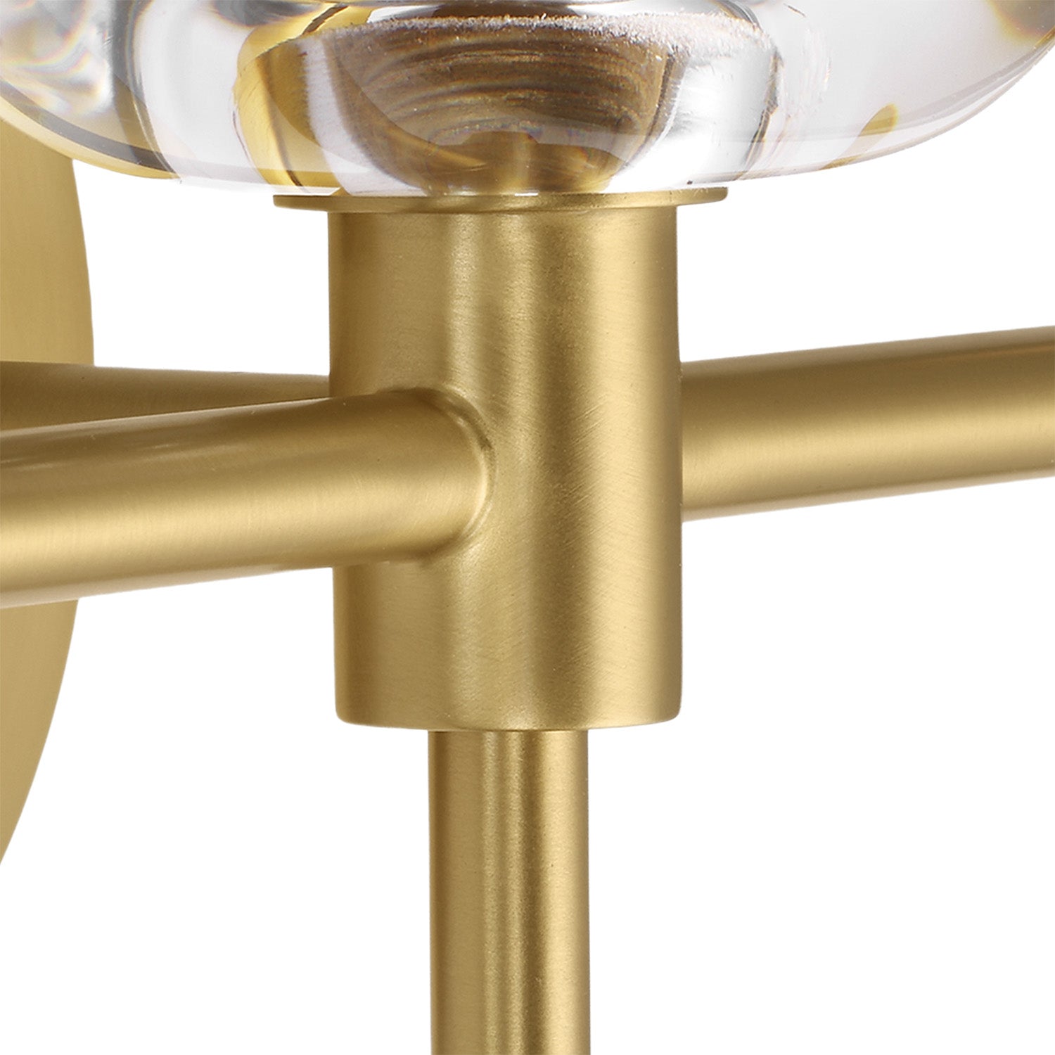 The Emrys 3 Light Vanity exemplifies bold and elegant contrast, reimagining timeless lighting design with a modern edge through its harmonious mix of materials and sculptural presence. This versatile vanity fixture features a thoughtful interplay of curved and linear elements that creates a sophisticated, sculptural silhouette designed to enhance a variety of interiors, perfect for bathrooms, powder rooms, vanity areas, and spaces seeking refined vanity lighting with contemporary style. The modern brass finish brings warm metallic sophistication while the clear glass shades showcase the bulbs within for distinctive illumination. With its damp-rated construction and striking design, this expertly crafted vanity fixture elevates any space with refined contemporary elegance and enduring appeal.