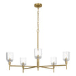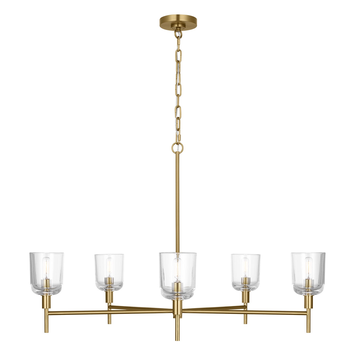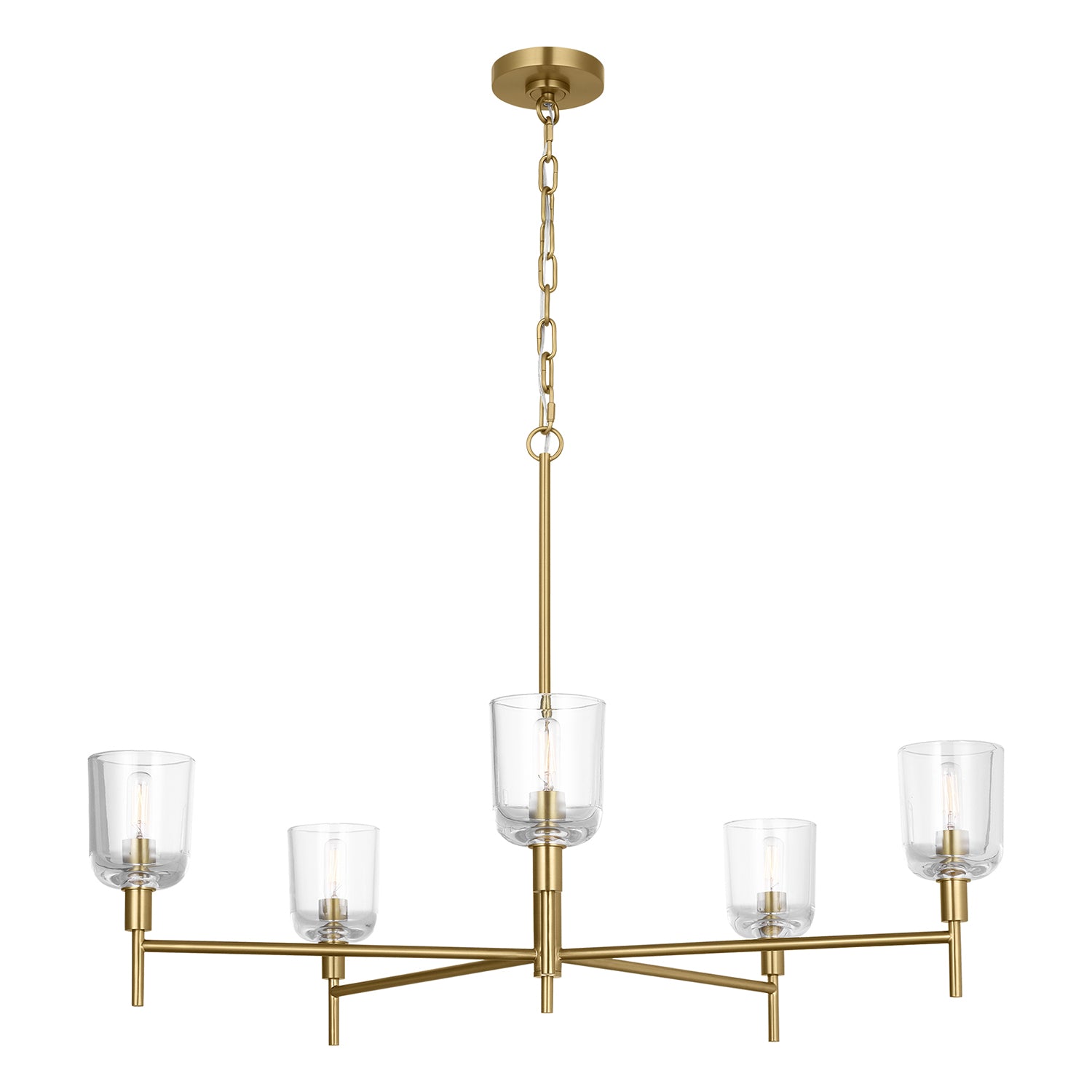 The Emrys 5 Light Chandelier exemplifies bold and elegant contrast, reimagining timeless lighting design with a modern edge through its harmonious mix of materials and sculptural presence. This versatile 36" chandelier features a thoughtful interplay of curved and linear elements that creates a sophisticated, sculptural silhouette designed to enhance a variety of interiors, perfect for grand dining rooms, large entryways, spacious living areas, foyers, and areas seeking refined chandelier lighting with commanding presence. The modern brass finish brings warm metallic sophistication while the clear glass shades showcase the bulbs within for distinctive illumination. With its damp-rated construction, substantial hanging range, and striking design, this expertly crafted chandelier elevates any space with refined contemporary elegance and enduring appeal.