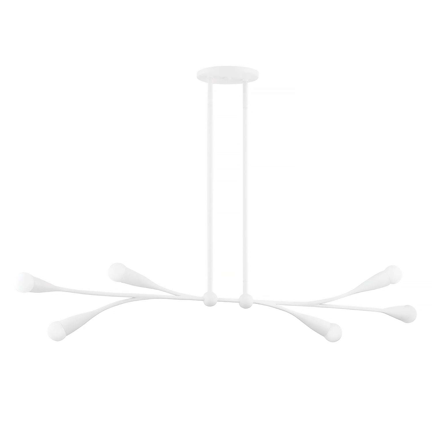 The Flora 6 Light Linear Chandelier captures the delicate beauty of blossoming branches with its organic, sculptural design. Featuring six slender textured white arms that extend gracefully from dual central spheres in a horizontal arrangement, each ending in a conical shade, this fixture creates an elegant botanical silhouette. The flowing linear disposition of the arms mimics natural growth patterns, bringing a sense of organic movement perfect over kitchen islands and dining tables. The Flora linear chandelier combines nature-inspired form with refined metalwork to create a statement lighting solution that enhances your space with artistic sophistication.