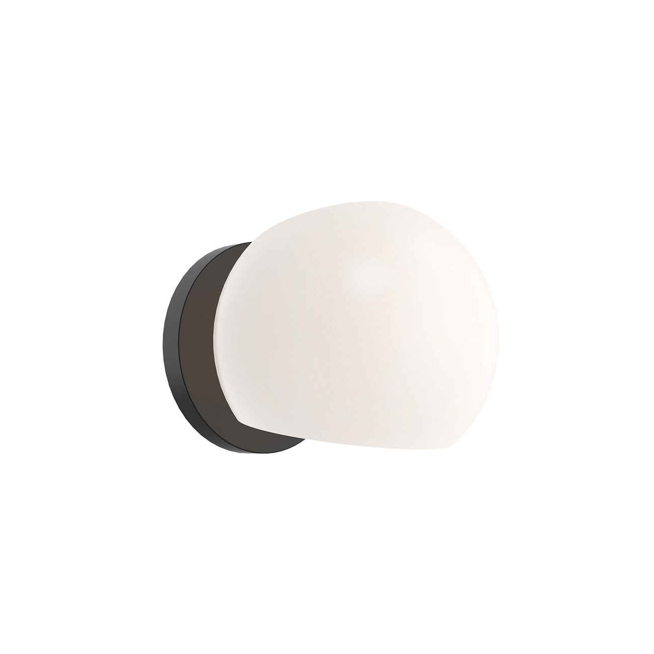 • Features a single opal glass globe mounted directly on a circular matte black backplate