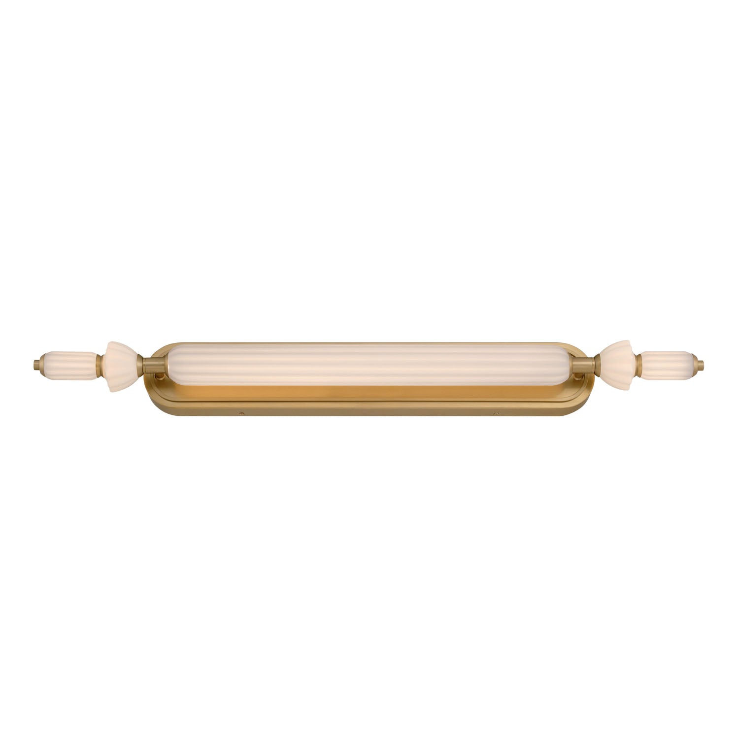 The Giselle LED Vanity brings contemporary chic to any bathroom with its sleek linear profile and sophisticated Brass framing. This striking fixture features a beautifully proportioned polished nickel structure that elegantly houses a ribbed opal glass diffuser, creating smooth, luxurious illumination that transforms daily routines while adding modern sophistication to vanity spaces. The brass finish combined with the flowing opal glass delivers polished elegance, perfect for contemporary bathrooms that demand both style and performance. At 39" wide with integrated LED technology, this vanity light makes a refined statement while providing decades of maintenance-free operation.