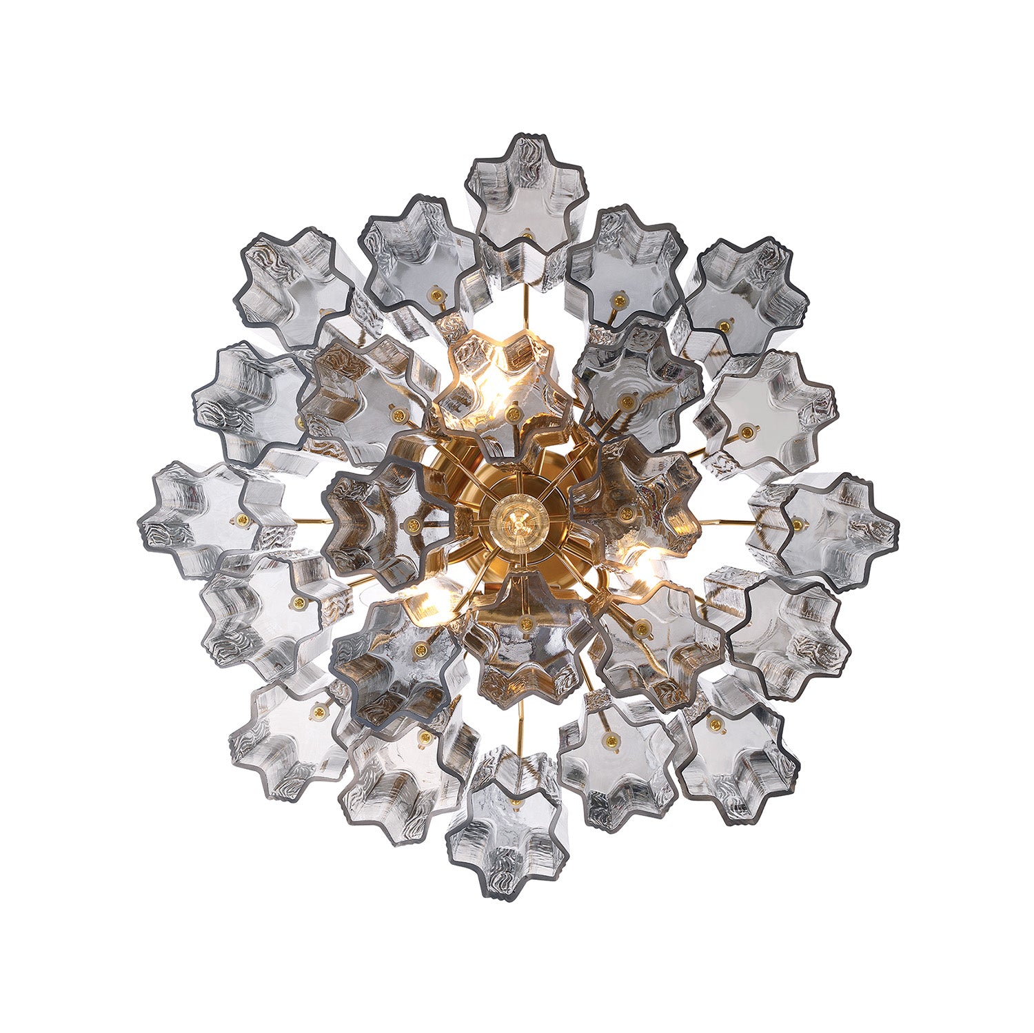 The Grace 4 Light Mini Chandelier in 18" brings sophisticated elegance to smaller spaces with its stunning combination of rich brass finish and moody textured Tronchi smoke glass. This charming fixture features cascading textured glass tubes arranged in a tiered formation that creates beautiful light diffusion while adding visual interest to dining nooks, entryways, and cozy living areas. The warm brass framework provides structural elegance, while the smoke glass delivers soft, evenly distributed illumination that enhances intimate spaces with luxurious ambiance. At just under 18" in diameter with 4 light sources, this mini chandelier delivers substantial presence and ample illumination, perfectly scaled for smaller rooms. The multi-panel glass design creates captivating shadows and light patterns, making it an ideal centerpiece for sophisticated interiors.