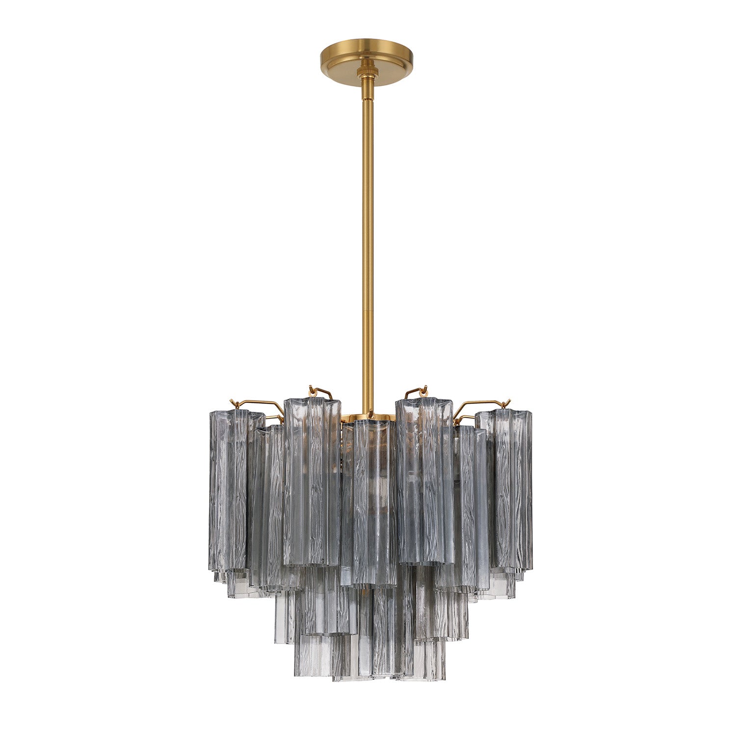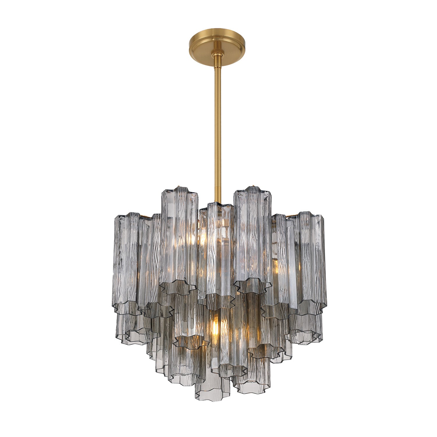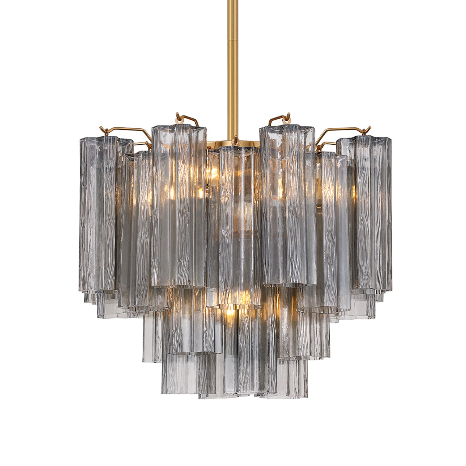 • Elegant mini chandelier featuring cascading grey textured Tronchi smoke glass panels in a refined brass framework for beautiful light diffusion