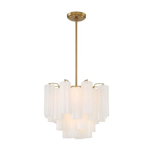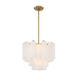 • Elegant mini chandelier featuring cascading white textured Tronchi glass panels in a refined brass framework for beautiful light diffusion