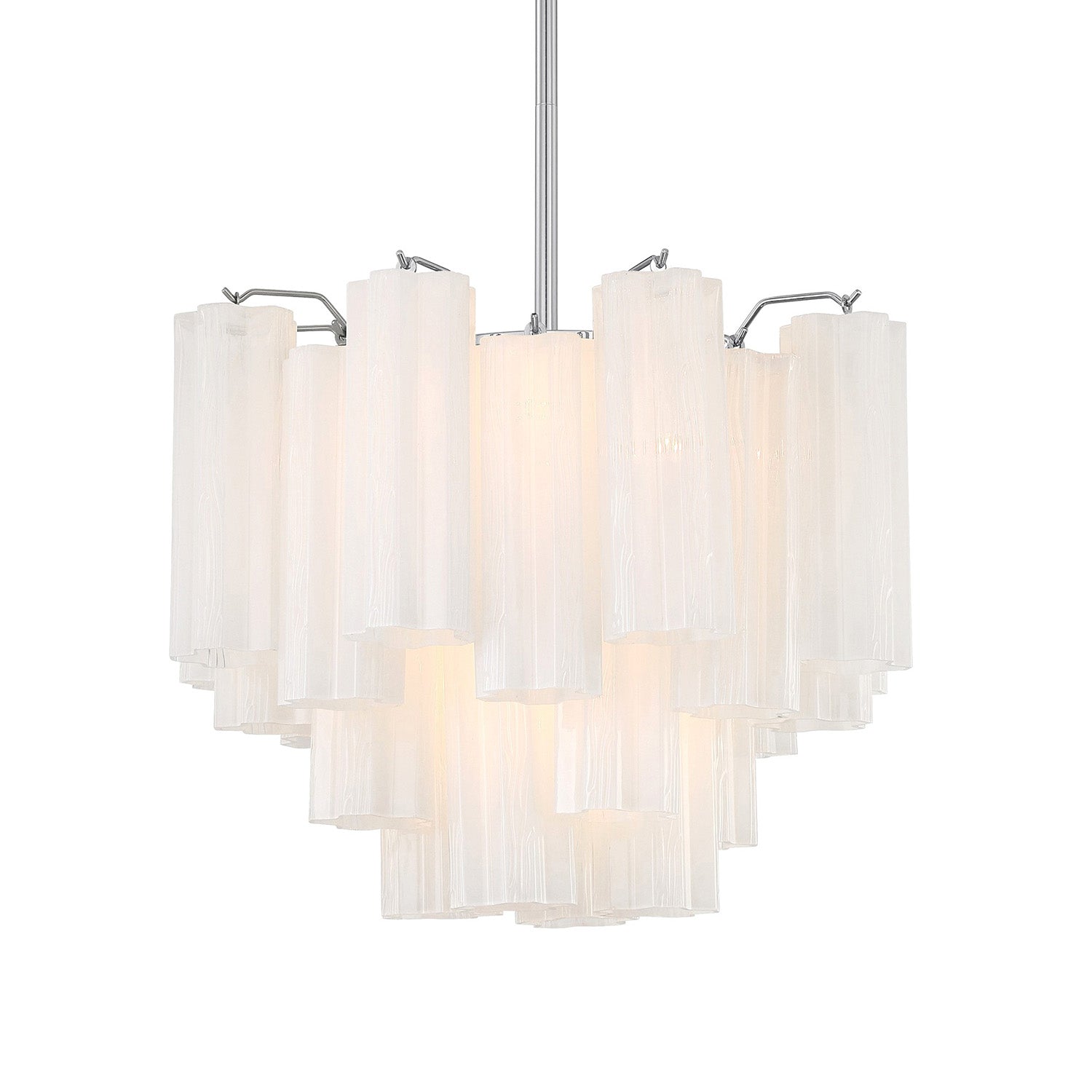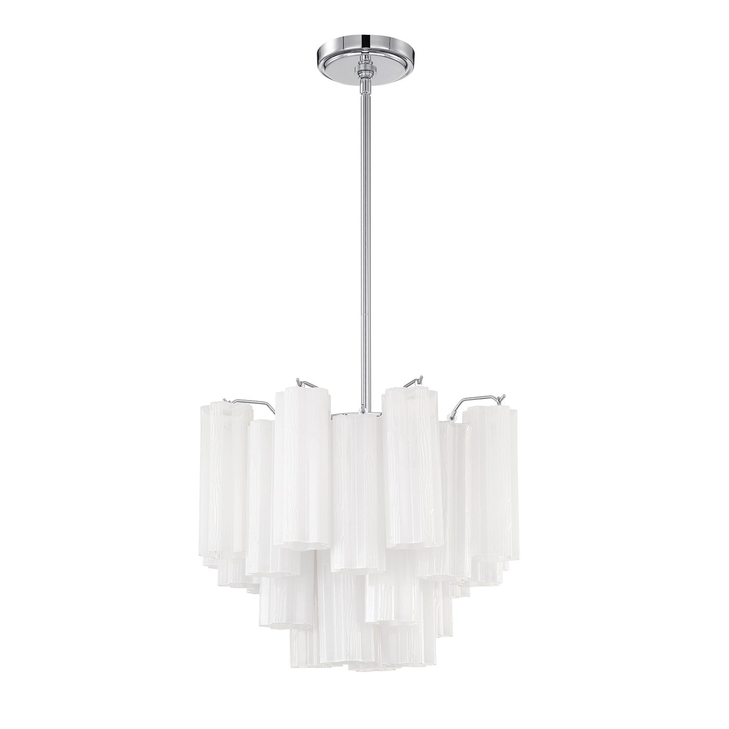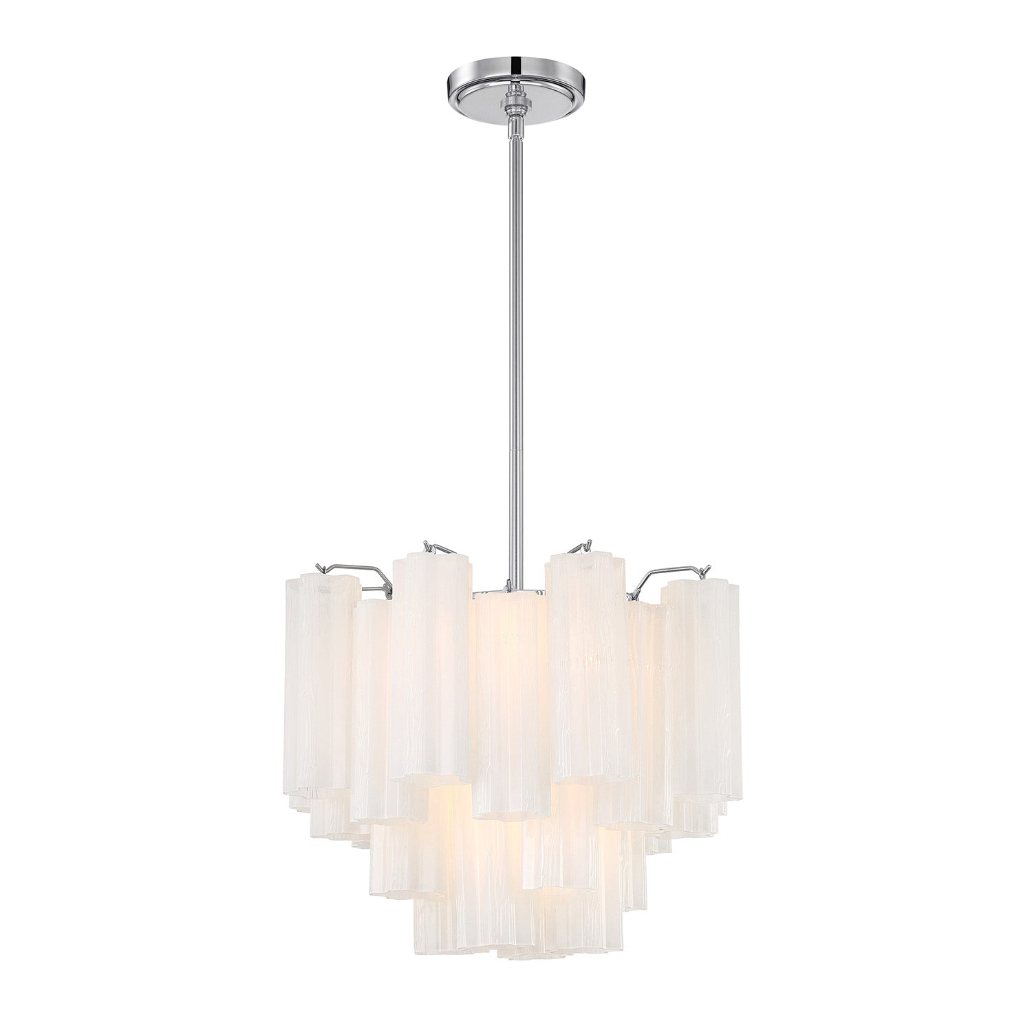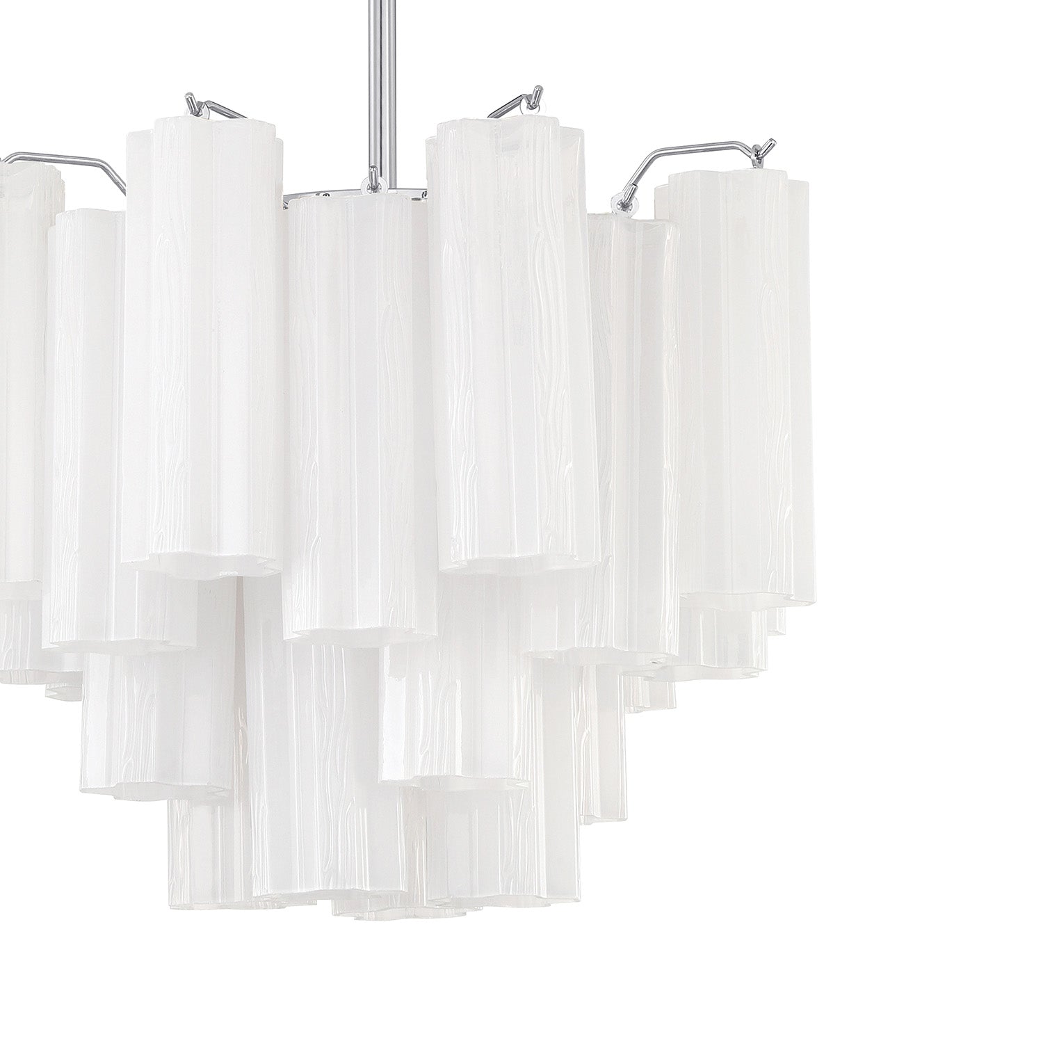 • Elegant mini chandelier featuring cascading white textured Tronchi glass panels in a refined chrome framework for beautiful light diffusion