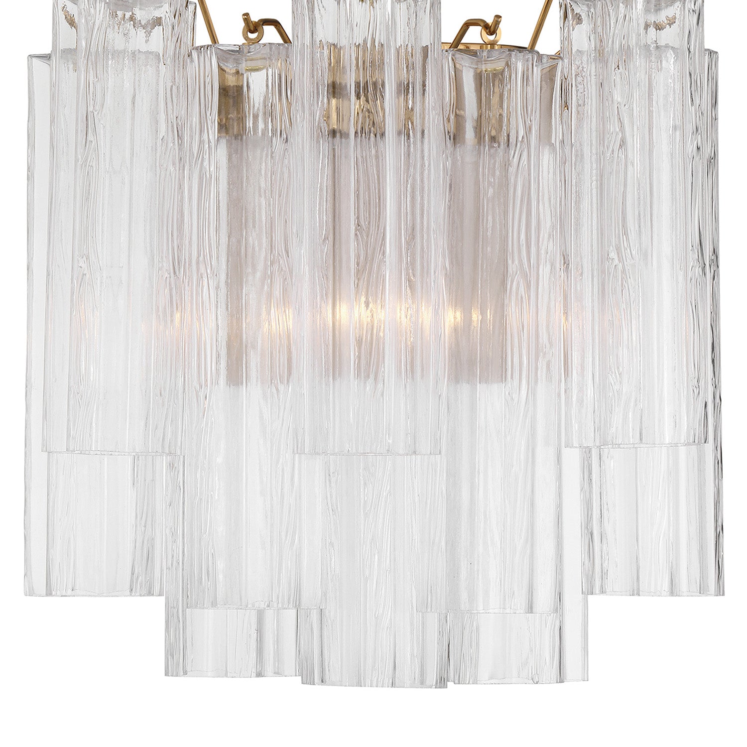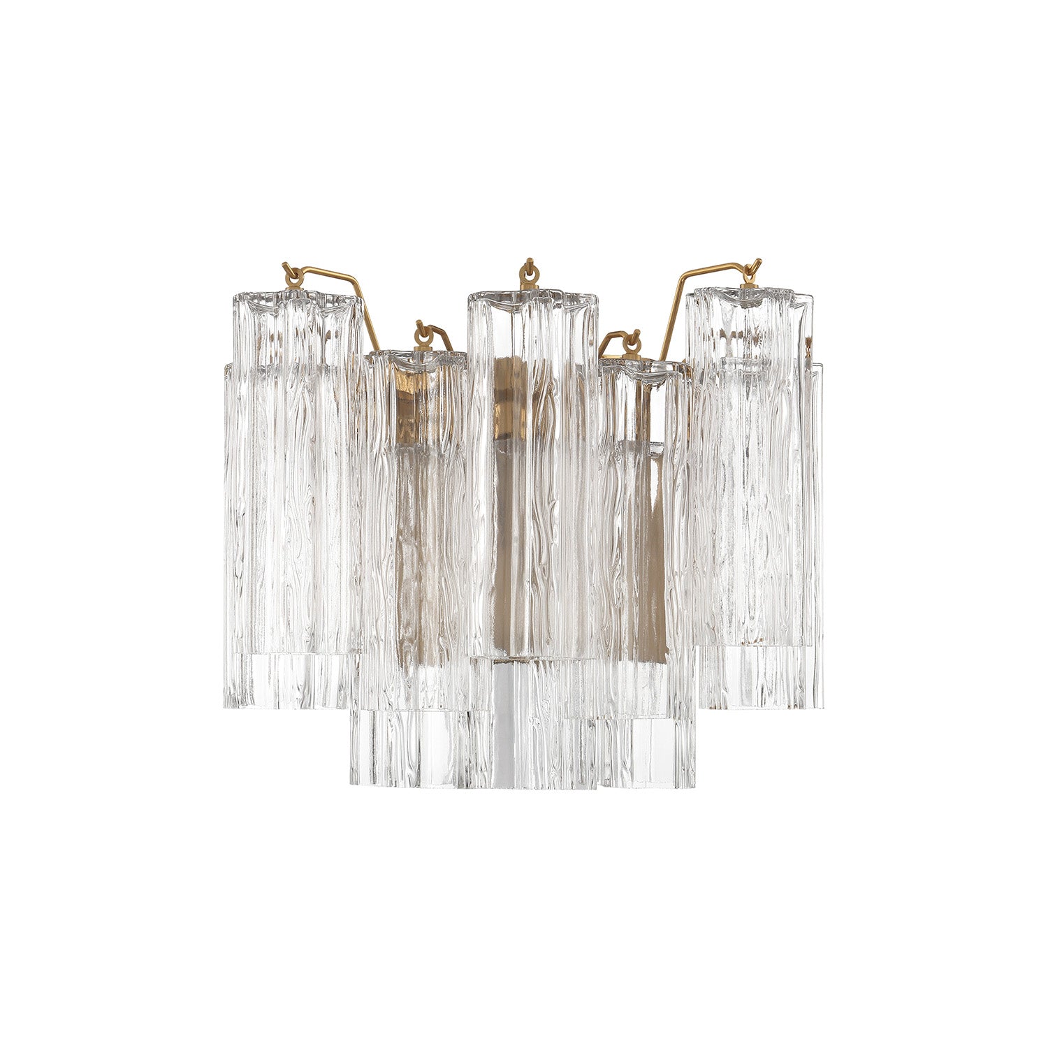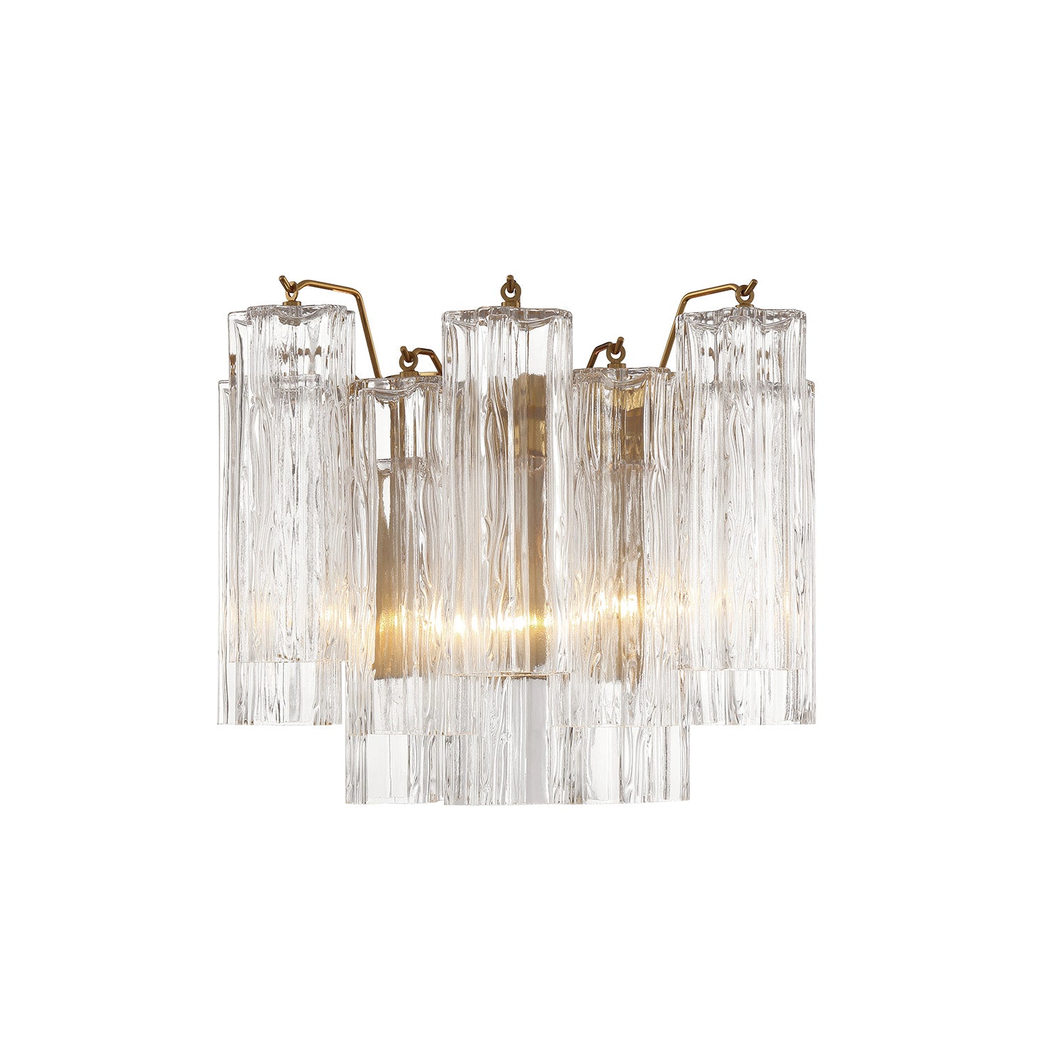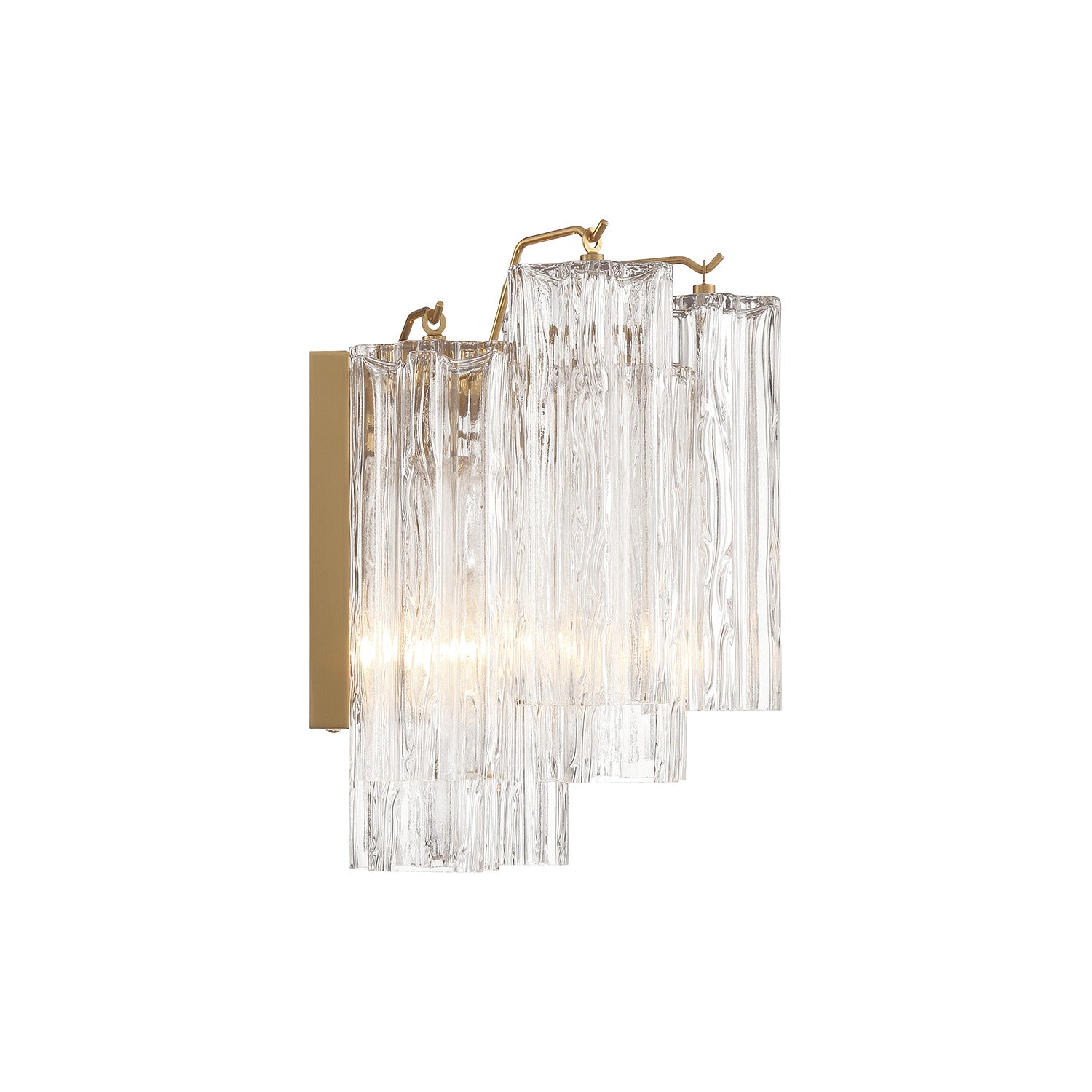 The Grace Wall Sconce in 12" brings sophisticated elegance to any space with its stunning combination of rich brass finish and pristine clear textured Tronchi glass. This elegant fixture features cascading glass tubes that create beautiful light diffusion while adding textural interest to walls. The warm brass framework provides structural elegance, while the crystal-clear glass delivers brilliant, unfiltered illumination that enhances the ambiance of hallways, bedrooms, dining rooms, and living spaces. At just under 12" in height with a generous 9.75" extension, this sconce delivers substantial presence and ample illumination. The multi-panel glass design creates captivating shadows and light patterns, making it as much a decorative accent as a functional lighting solution.
