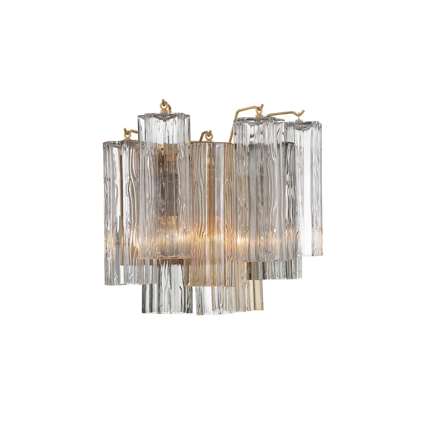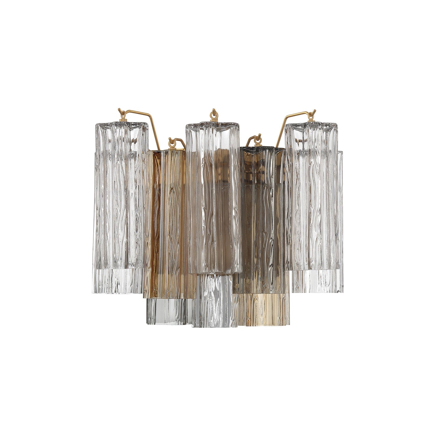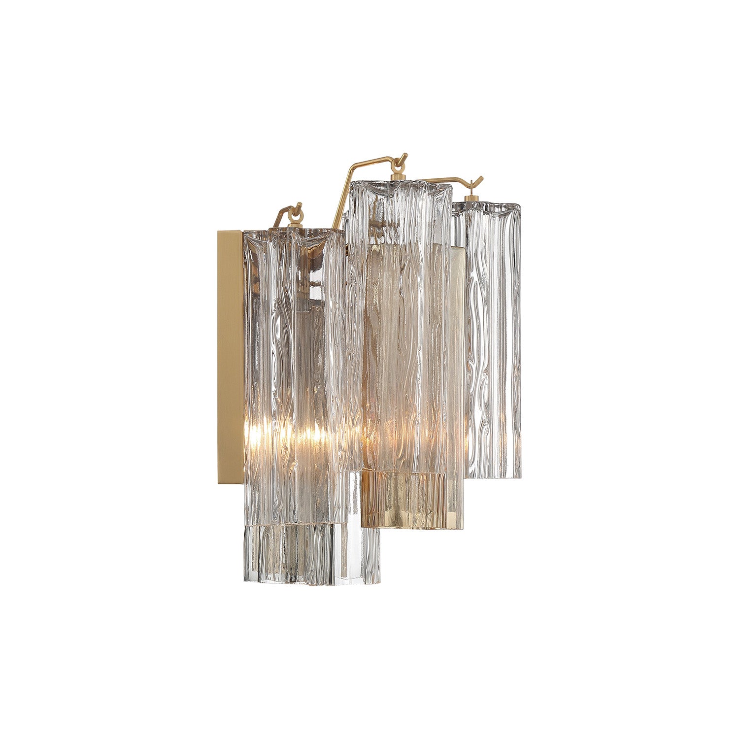 The Grace Wall Sconce in 12" brings sophisticated elegance to any space with its stunning combination of rich brass finish and luminous gilded fog Tronchi glass. This elegant fixture features cascading textured glass tubes that create beautiful light diffusion while adding textural interest to walls. The warm brass framework provides structural elegance, while the multi-colored gilded fog glass casts a soft, ethereal glow with subtle golden undertones that enhances the ambiance of hallways, bedrooms, dining rooms, and living spaces. At just under 12" in height with a generous 9.75" extension, this sconce delivers substantial presence and ample illumination. The multi-panel glass design creates captivating shadows and light patterns, making it as much a decorative accent as a functional lighting solution.