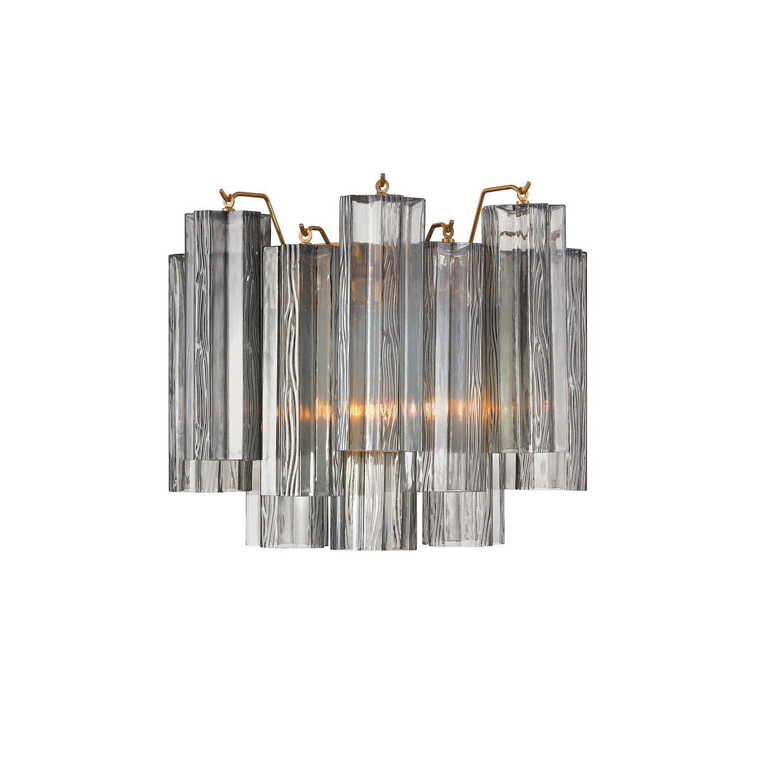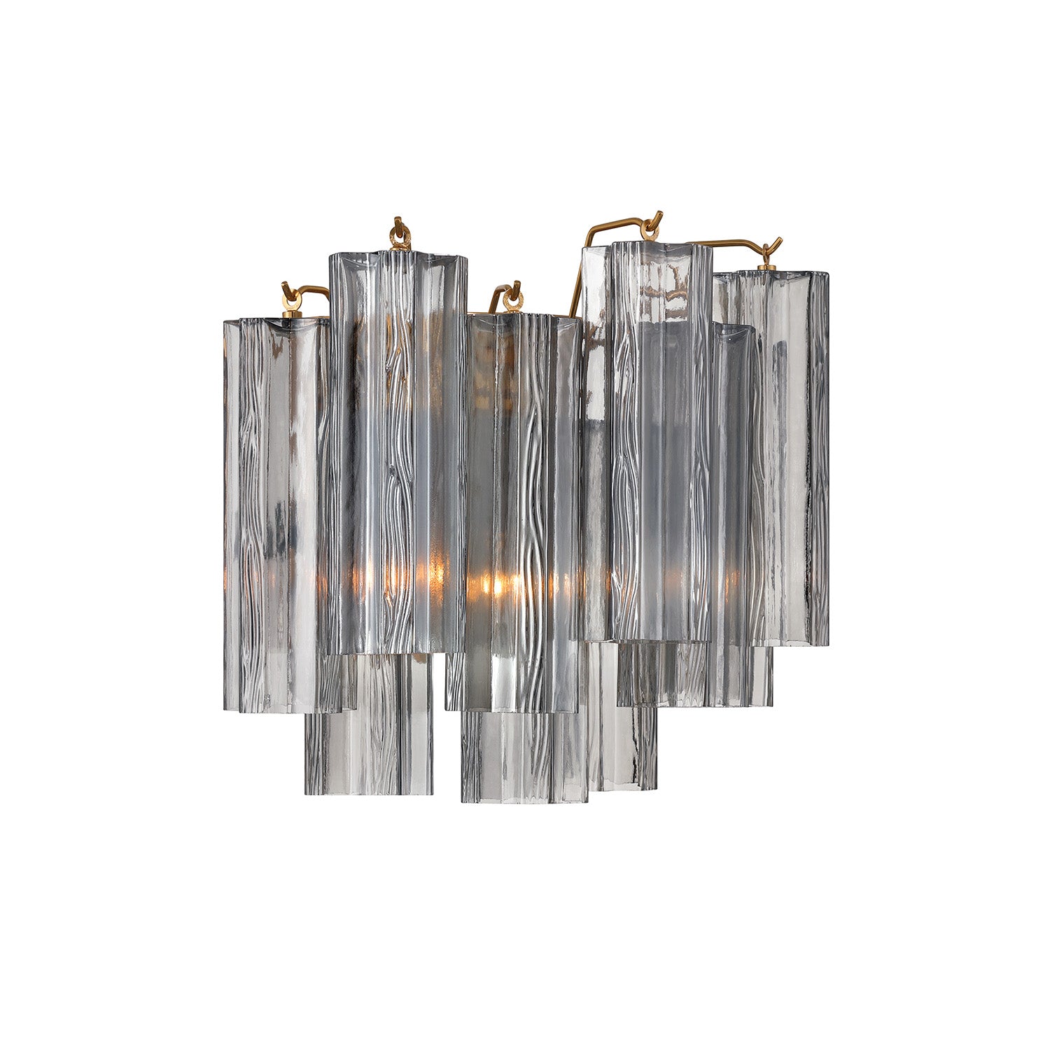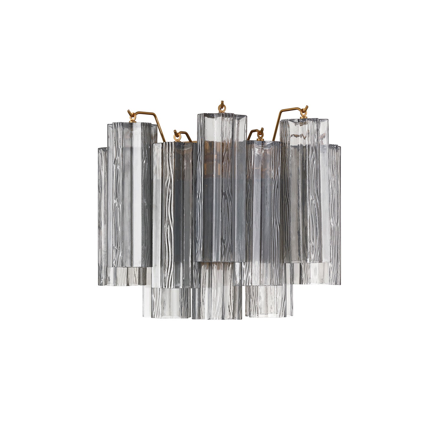 • Striking wall sconce featuring cascading textured Tronchi smoke glass panels in a refined brass framework for elegant light diffusion
