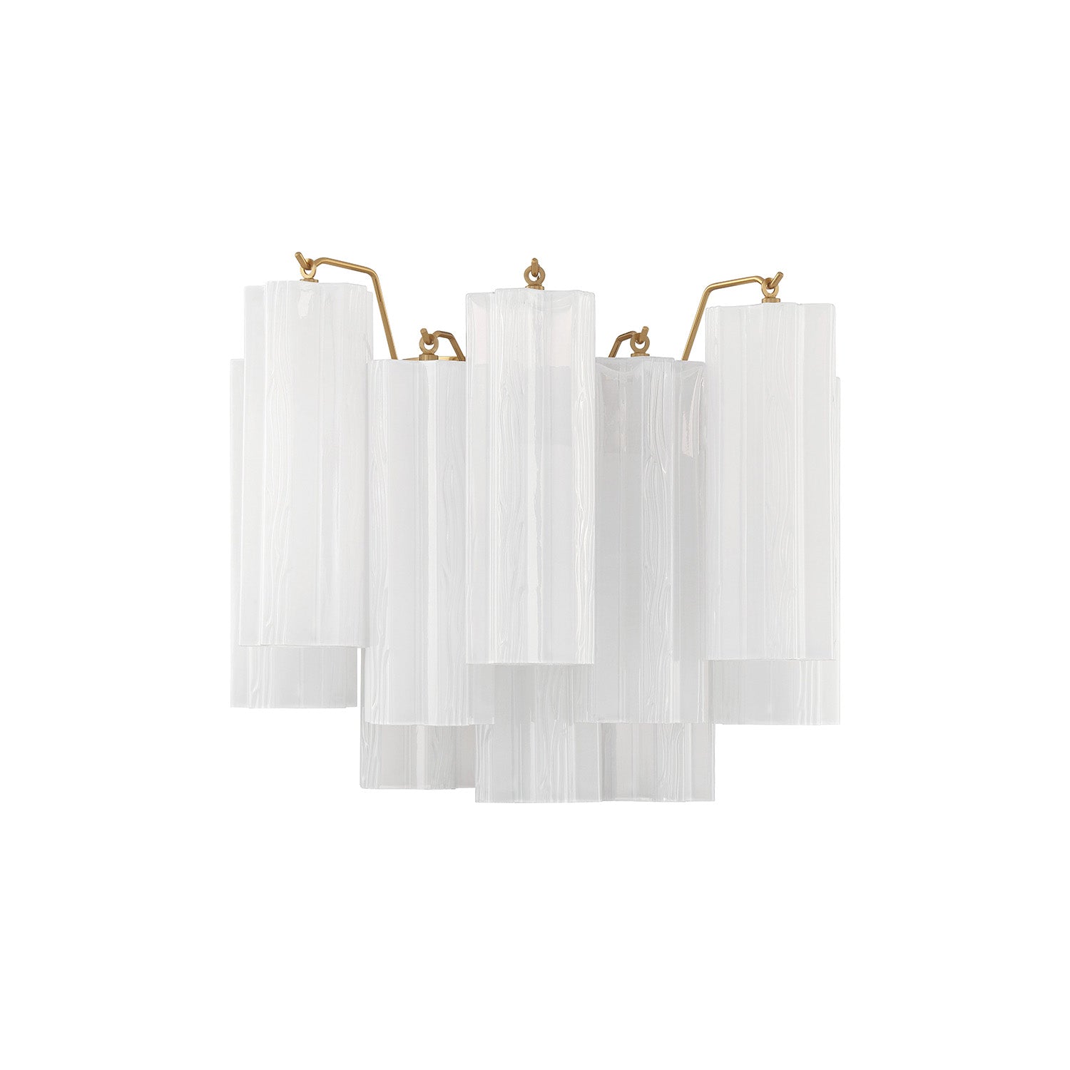 The Grace Wall Sconce in 12" brings sophisticated elegance to any space with its stunning combination of rich brass finish and pristine white textured Tronchi glass. This elegant fixture features cascading glass tubes that create beautiful light diffusion while adding textural interest to walls. The warm brass framework provides structural elegance, while the crisp white glass delivers soft, evenly distributed illumination that enhances the ambiance of hallways, bedrooms, dining rooms, and living spaces. At just under 12" in height with a generous 9.75" extension, this sconce delivers substantial presence and ample illumination. The multi-panel glass design creates captivating shadows and light patterns, making it as much a decorative accent as a functional lighting solution.