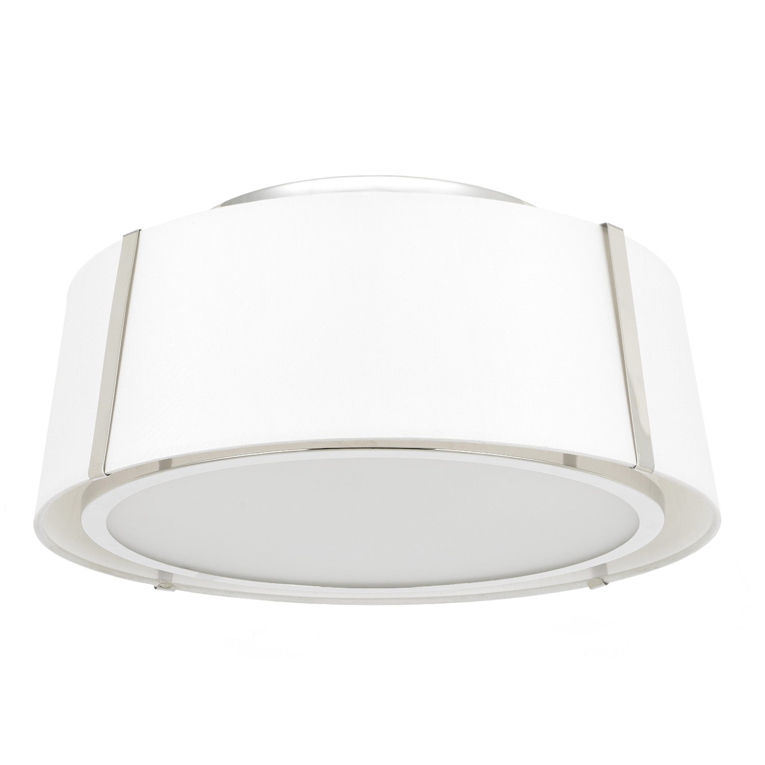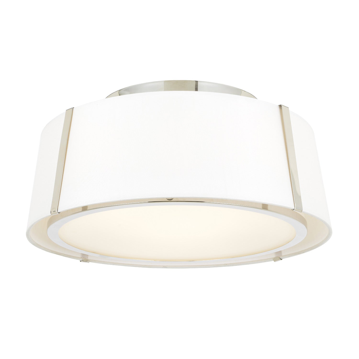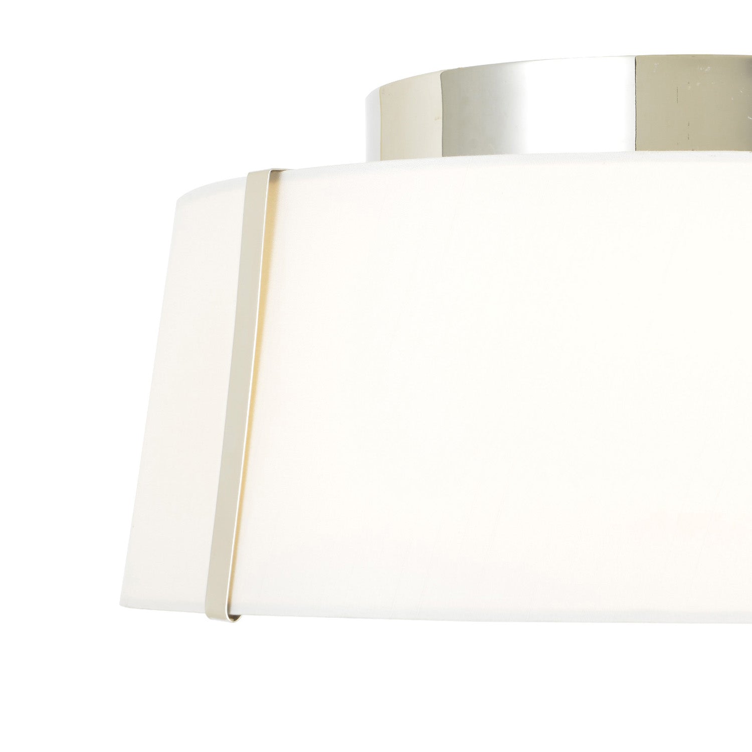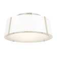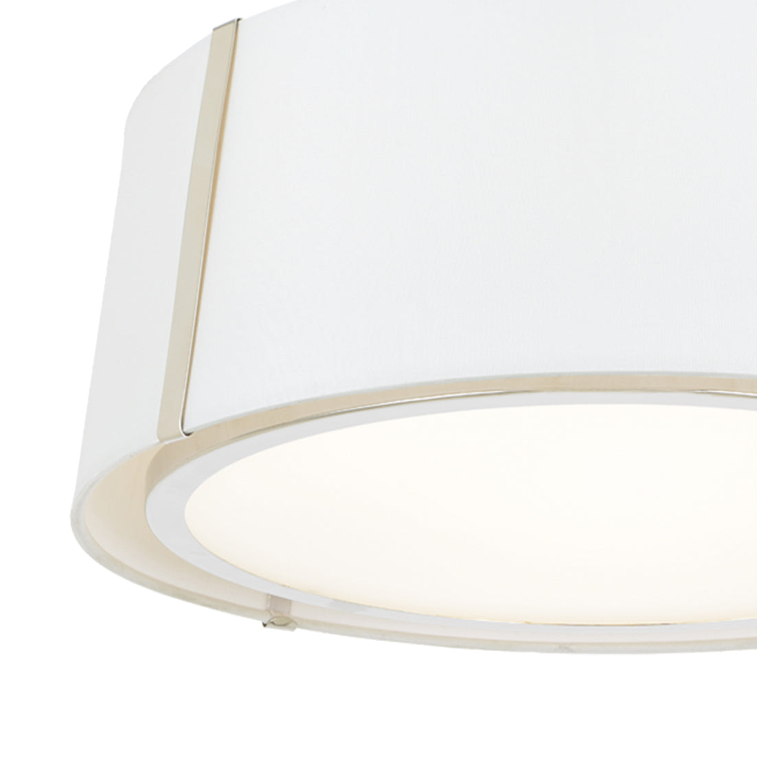 The Hoyt Flush Mount elevates ceiling lighting with its refined integration of architectural elements and sophisticated materials. This generously sized fixture features a distinctive double white silk shade composition, where the interior layer is elegantly defined by a polished nickel ring securing a glass diffuser. At an impressive 18" diameter, this flush mount delivers abundant light distribution, ideal for living spaces, dining areas, or master bedrooms with lower ceiling heights. The elegant polished nickel finish introduces subtle luxury, while the luminous silk shade produces a gentle, evenly dispersed glow that eliminates harsh shadows. The Hoyt's design moves effortlessly between classic and contemporary interior styles, bringing architectural refinement to intimate spaces.