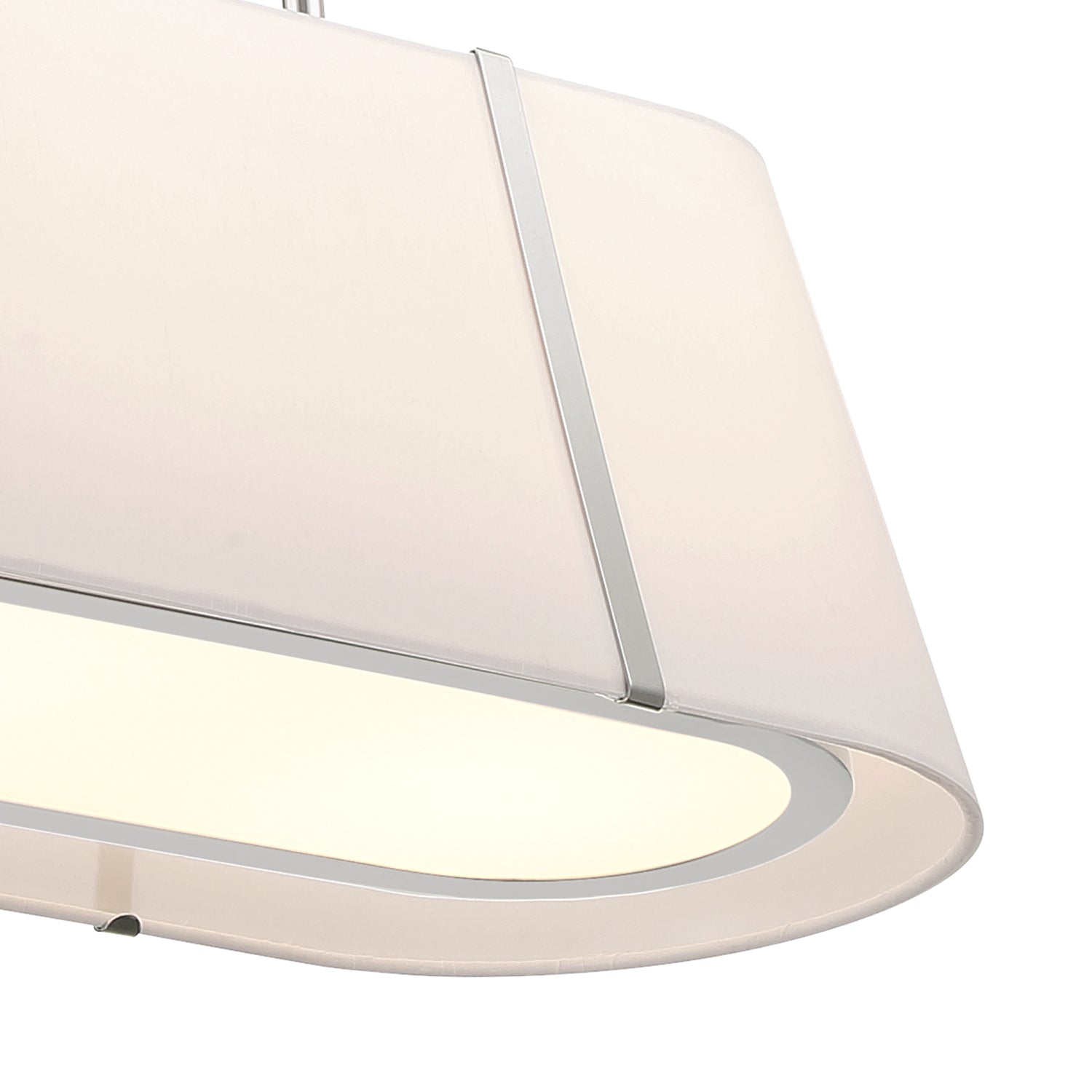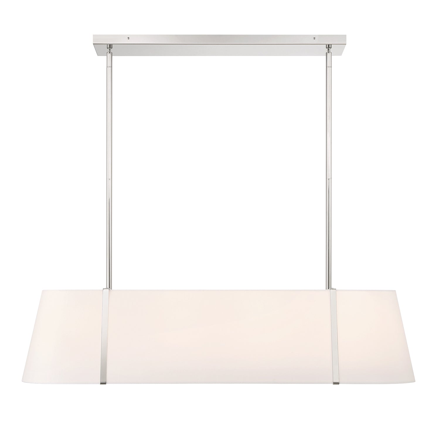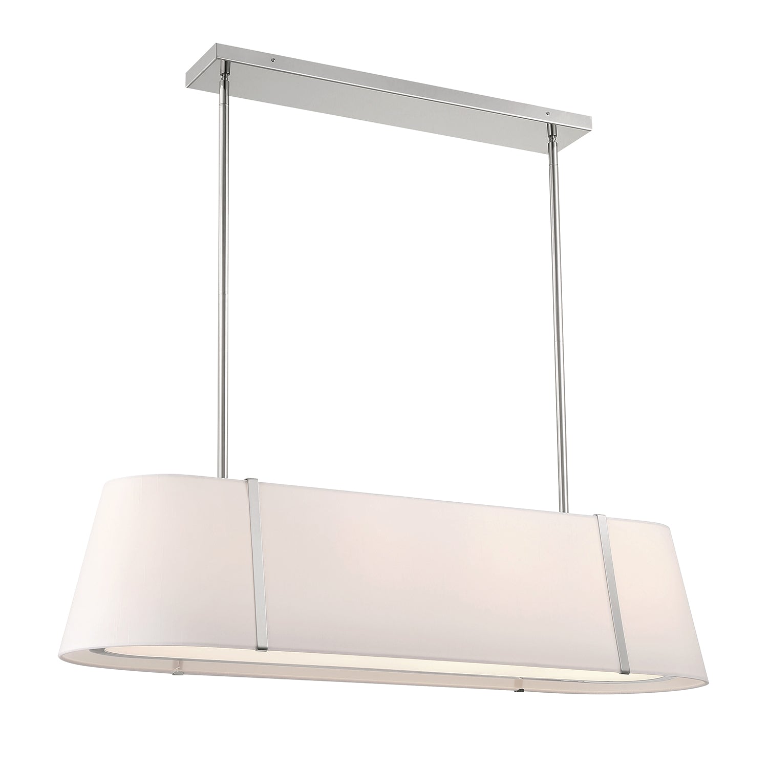 • Elegant linear pendant featuring a double white silk shade with glass diffuser trimmed in polished nickel metal