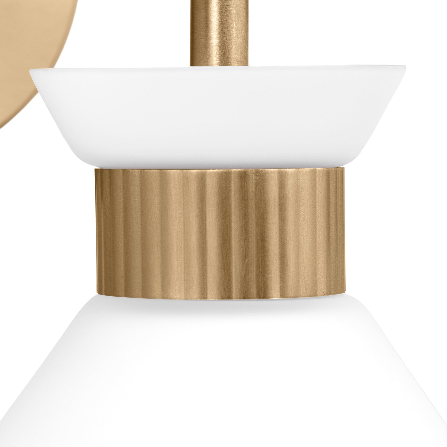 • Satin brass finish with etched white glass complements transitional and contemporary interiors