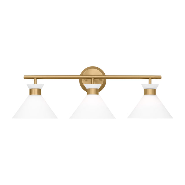 The Issa 3 Light Vanity is inspired by playful mid-century modern design, accentuated by flared glass shades with ribbed metal details and etched white glass that bestows an almost whimsical touch to the clean design. This versatile fixture is perfect for bathrooms, powder rooms, and spaces seeking distinctive lighting with contemporary appeal. The combination of satin brass finish with etched white glass creates warm elegance while delivering abundant illumination for daily routines. This fixture may be mounted in the up or down position and is ETL listed for damp locations, making it the perfect lighting solution for any space. With its dimmable capabilities and expert construction, this vanity light transforms any space with distinctive style and performance.