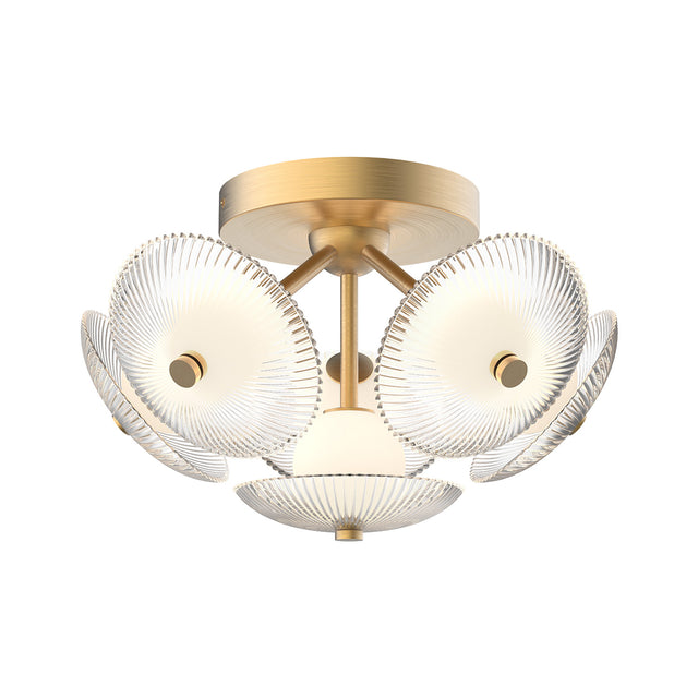 • Radial ceiling light features six clear ribbed glass discs with a Brushed Brass frame and opal glass LED spheres