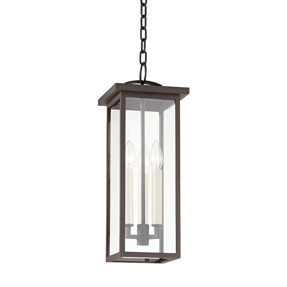 The Sullivan Outdoor Hanging Light brings contemporary sophistication to covered exterior spaces with its clean architectural design. This pendant fixture features a sleek rectangular silhouette in textured bronze with clear glass panels that create an open, airy appearance. The minimalist frame showcases three candle-style lights within, creating a warm, layered glow that enhances your outdoor living areas. A subtle handle detail crowns the fixture, adding a refined finishing touch. Sullivan is crafted from an exclusive EPM material that can handle UV and salt exposure for years to come. Offering modern elegance while providing excellent illumination for porches, covered patios, or entryways, this fixture complements various architectural designs from mid-century to modern farmhouse.