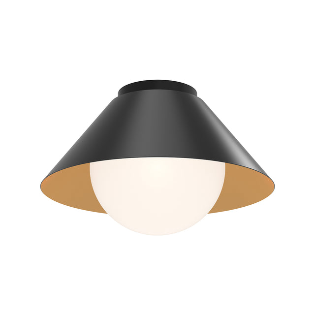 The Juno Flush Mount features a striking design with a wide conical matte black shade that reveals a luxurious brushed brass interior. This sophisticated ceiling fixture showcases the clean, geometric lines of the metal shade which dramatically frames the soft, white glass diffuser at its center. The integrated opal glass element provides warm, even illumination that's both functional and flattering, while the metallic interior adds a warm reflective quality that enhances the light output. Measuring 14" in diameter with a low profile height, the Juno flush mount adds architectural interest to spaces with lower ceilings such as hallways, bedrooms, or smaller living areas. The bold black exterior paired with the warm brass interior creates a captivating dual-tone effect that enhances a variety of interior styles.