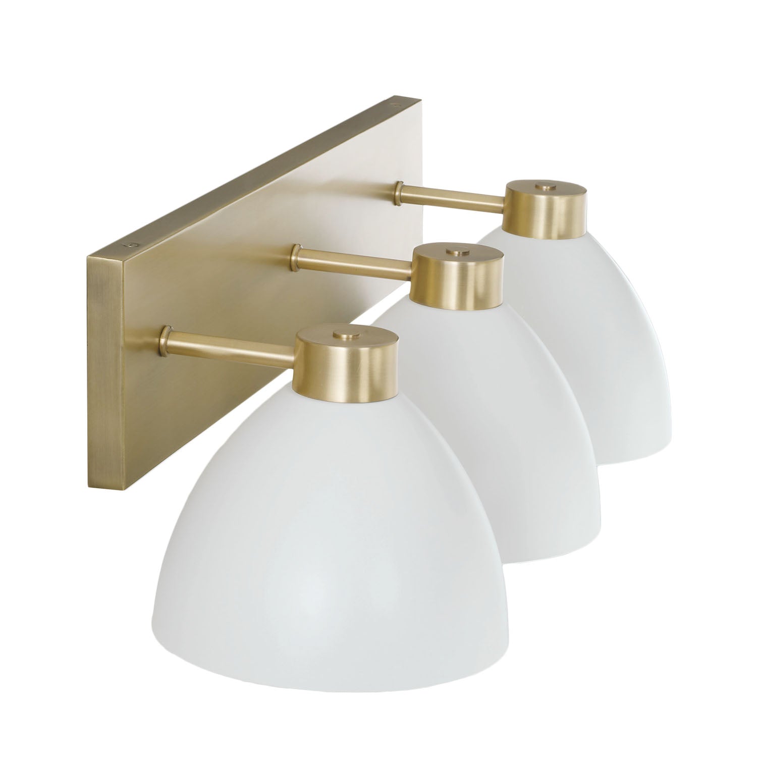 The Cleo 3 Light Vanity brings modern mid-century style to your bathroom with its fresh design and distinctive white and aged brass finish. Featuring three crisp white shades with warm aged brass accents, this fixture delivers bright, even illumination perfect for daily grooming and self-care routines. The striking two-tone finish combines contemporary sophistication with mid-century warmth, creating a perfect balance of modern and vintage appeal for any vanity space. The Cleo vanity light combines iconic mid-century lines with a sophisticated color combination to create a distinctive lighting solution that transforms your bathroom with modern sophistication.