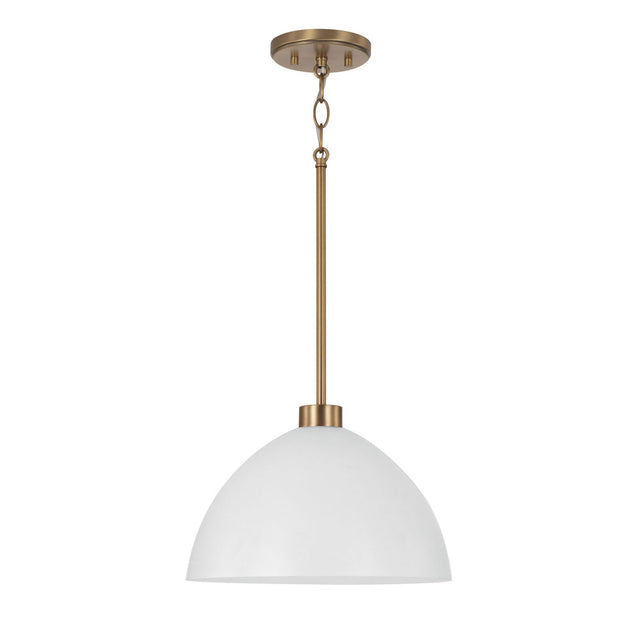 The Cleo Pendant brings modern mid-century style to any space with its fresh design and distinctive white and aged brass finish. Featuring a crisp white shade suspended from warm, aged brass accents, this fixture delivers soft, diffused illumination perfect for kitchen islands, dining areas, or entryways. The striking two-tone finish combines contemporary sophistication with mid-century warmth, creating a perfect balance of modern and vintage appeal. The Cleo pendant combines iconic mid-century lines with a sophisticated color combination to create a distinctive lighting solution that enhances your space with modern sophistication.
