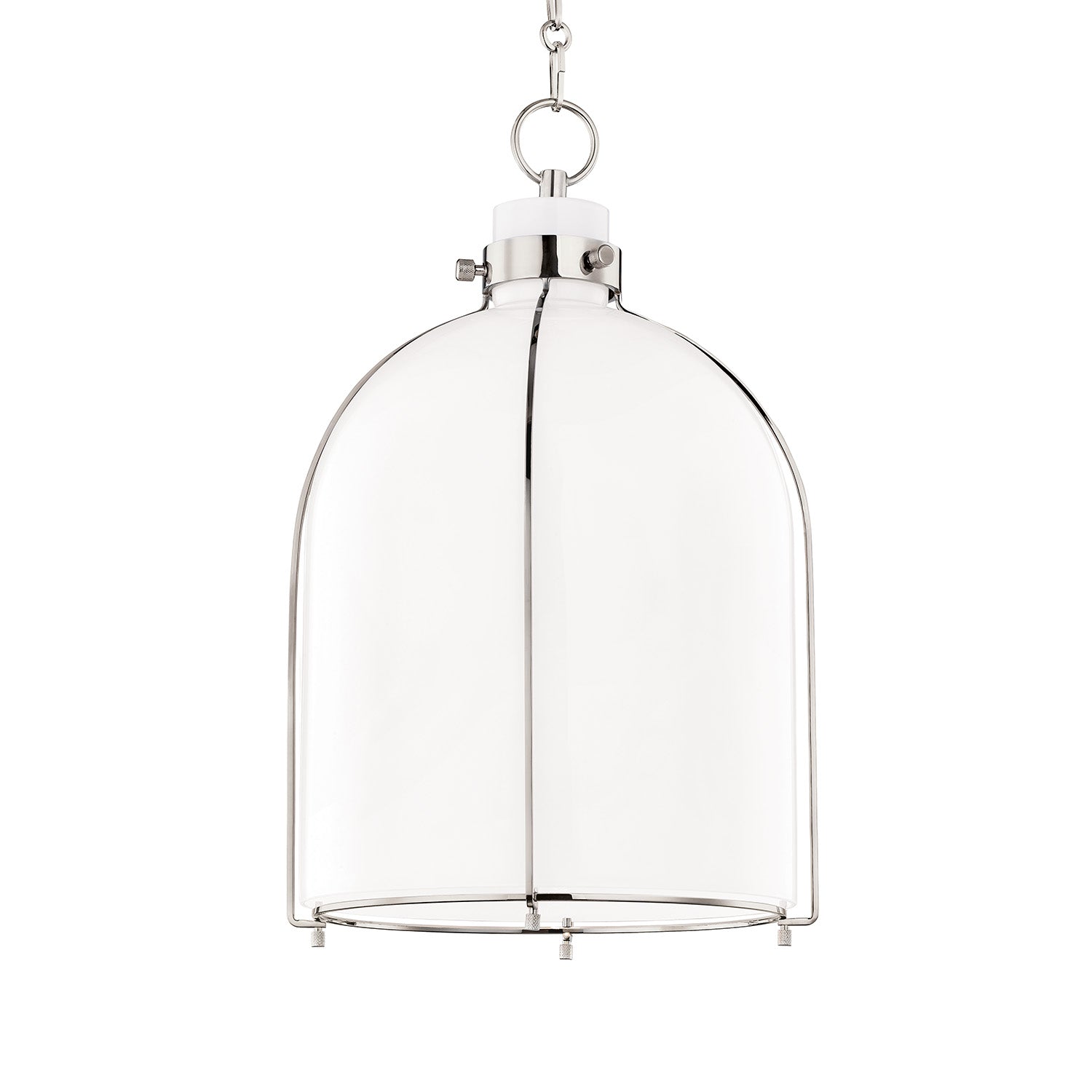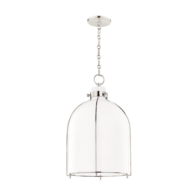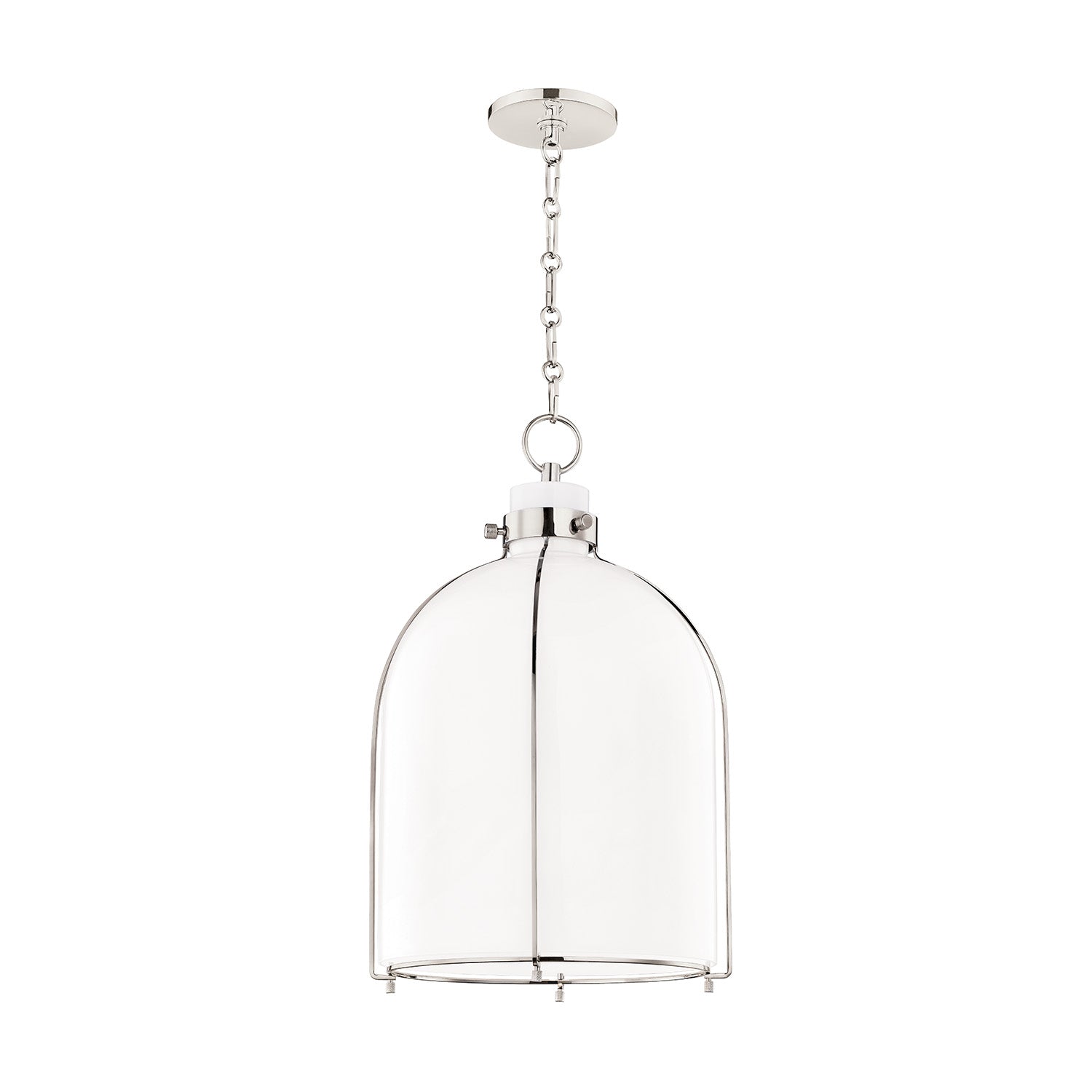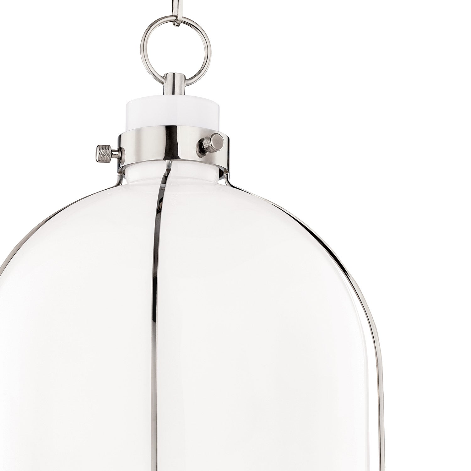 • The Lana Pendant features a polished nickel cage framework with a glossy opal glass dome shade