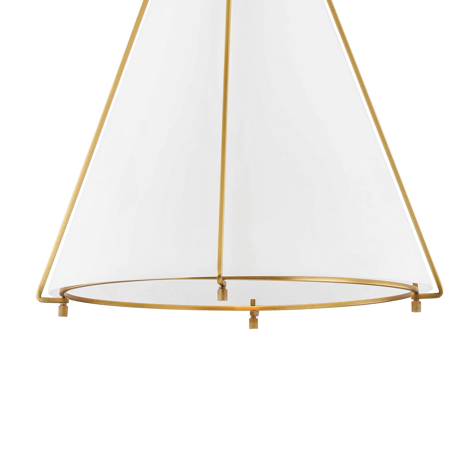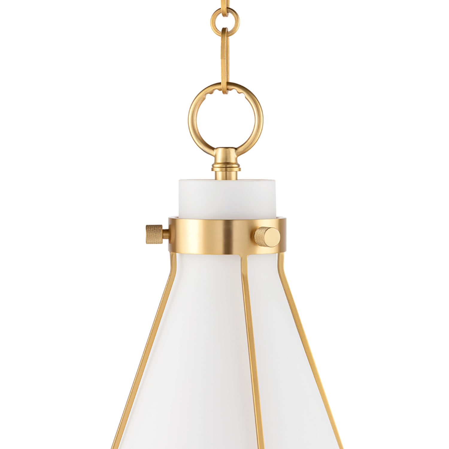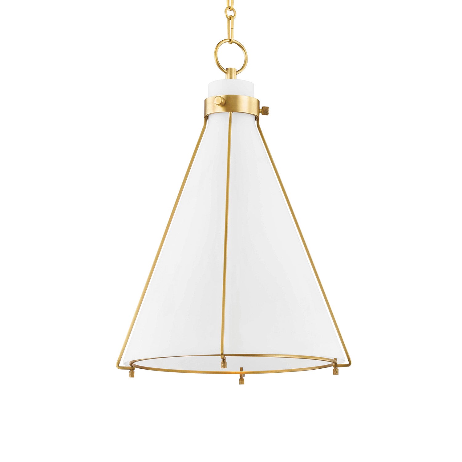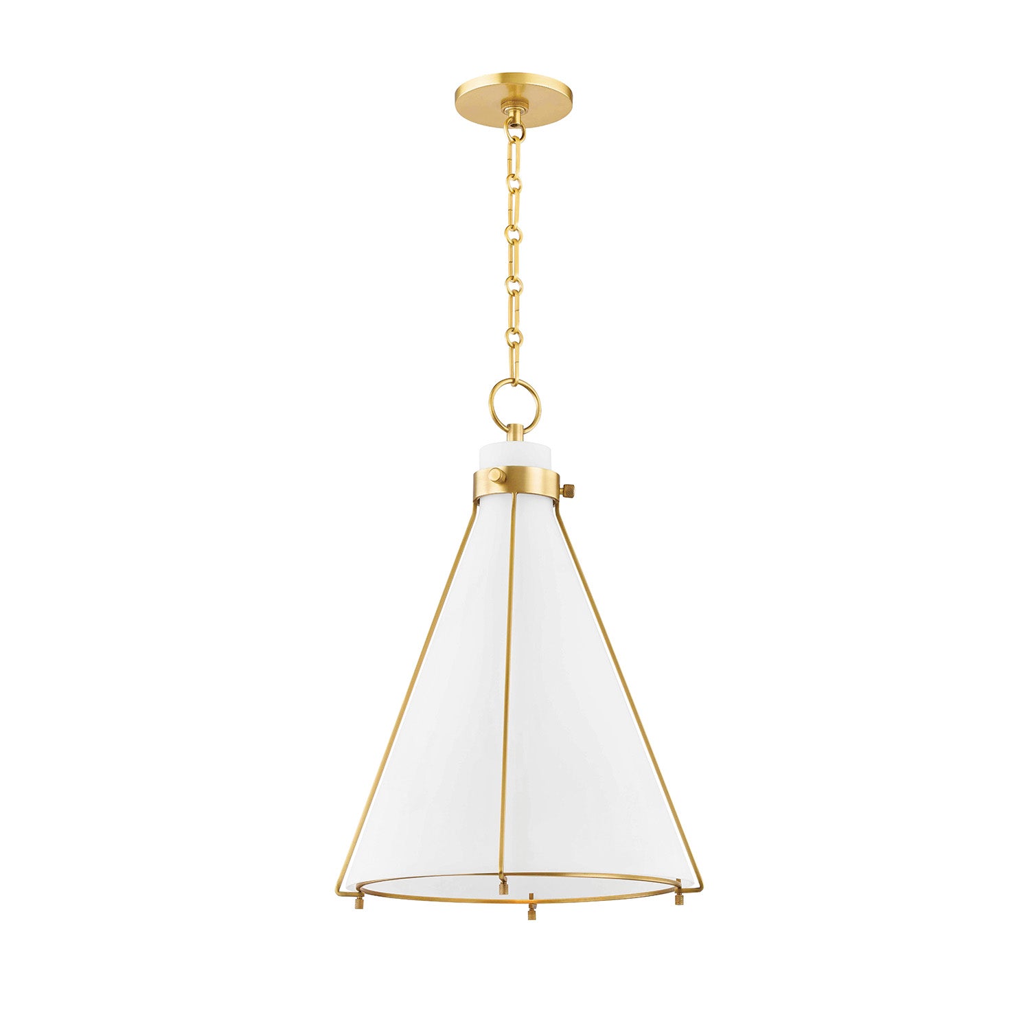 • The Leo Pendant features an aged brass cage framework with a glossy opal glass conical shade