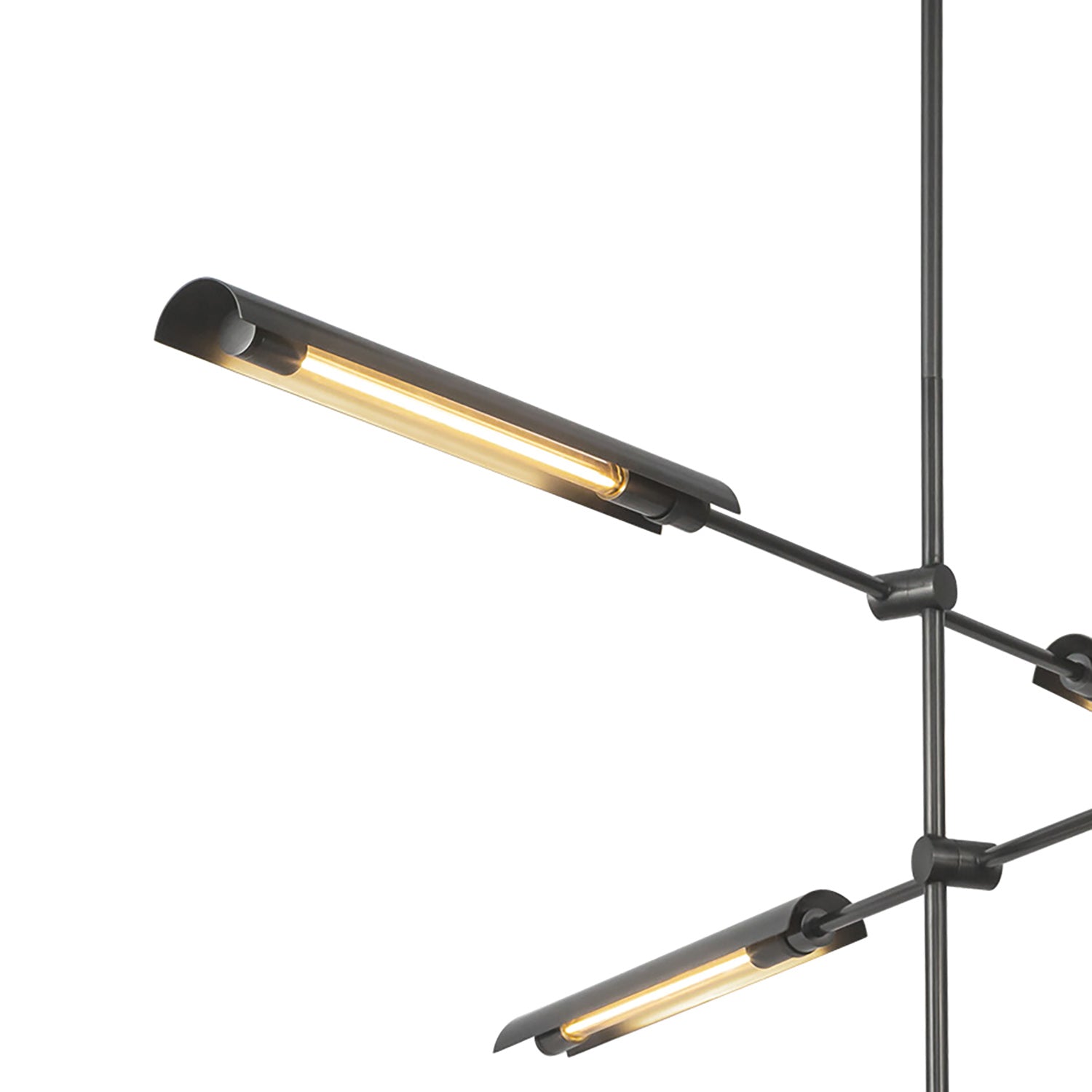 • Mid-century modern metal chandelier finished in urban bronze, featuring three rotating and adjustable arms