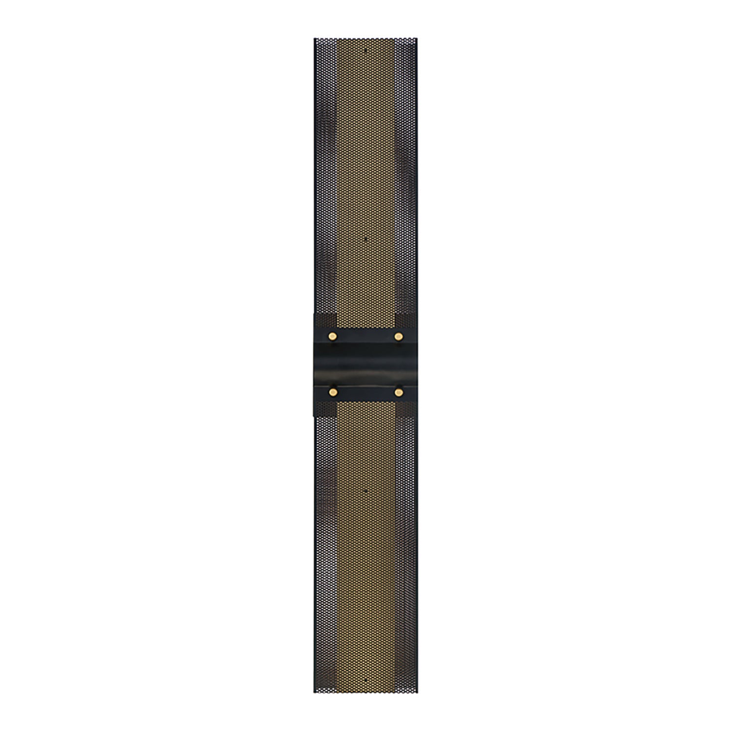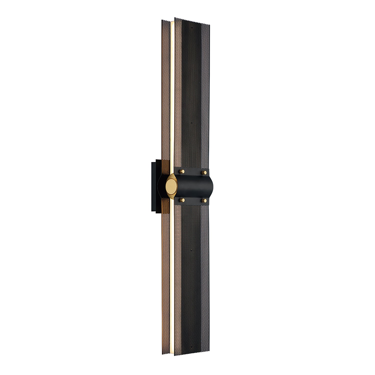 • Bold linear design with filigreed cut metal, finished in black with brass accents, featuring integrated LED technology that follows the elongated form for brilliant ambient illumination