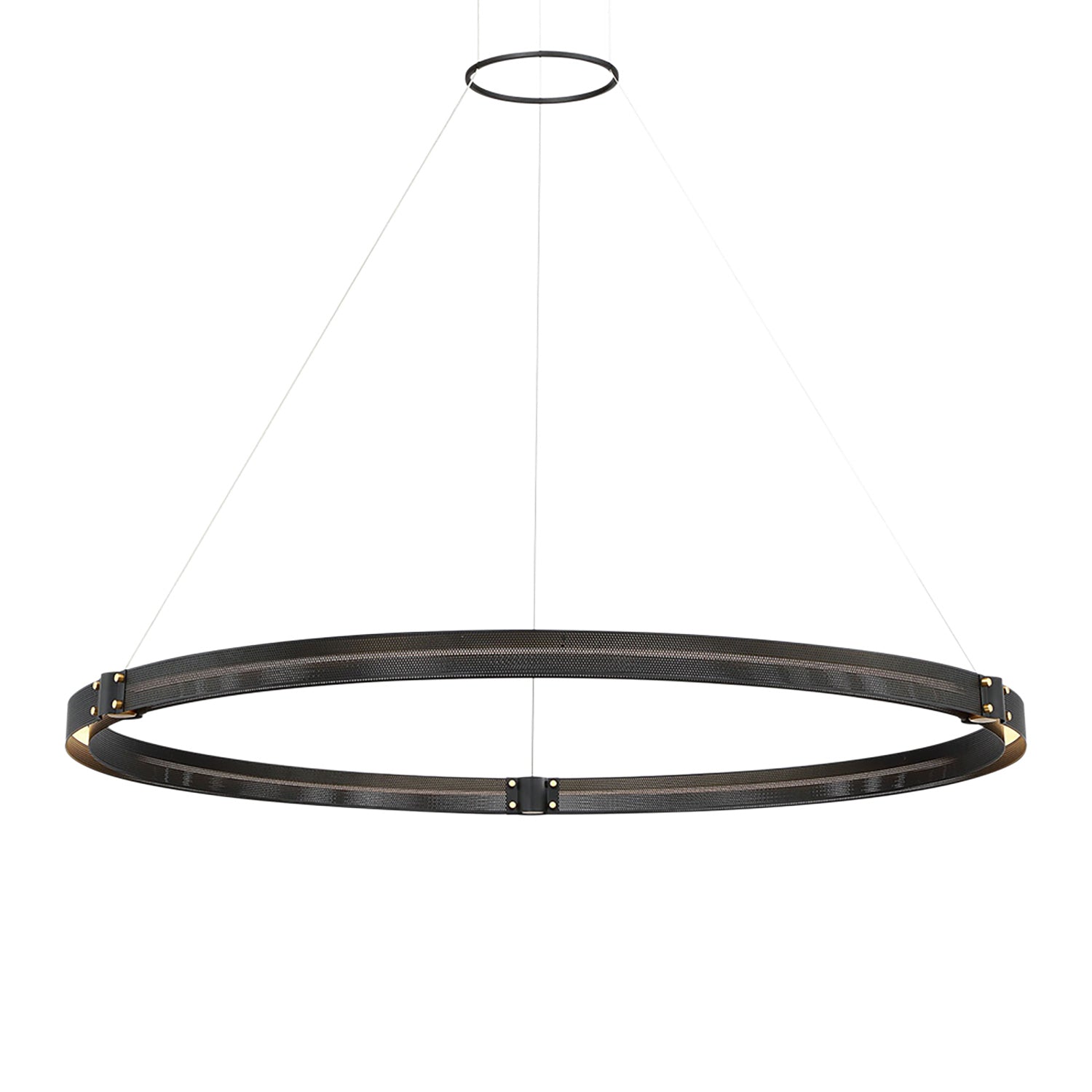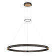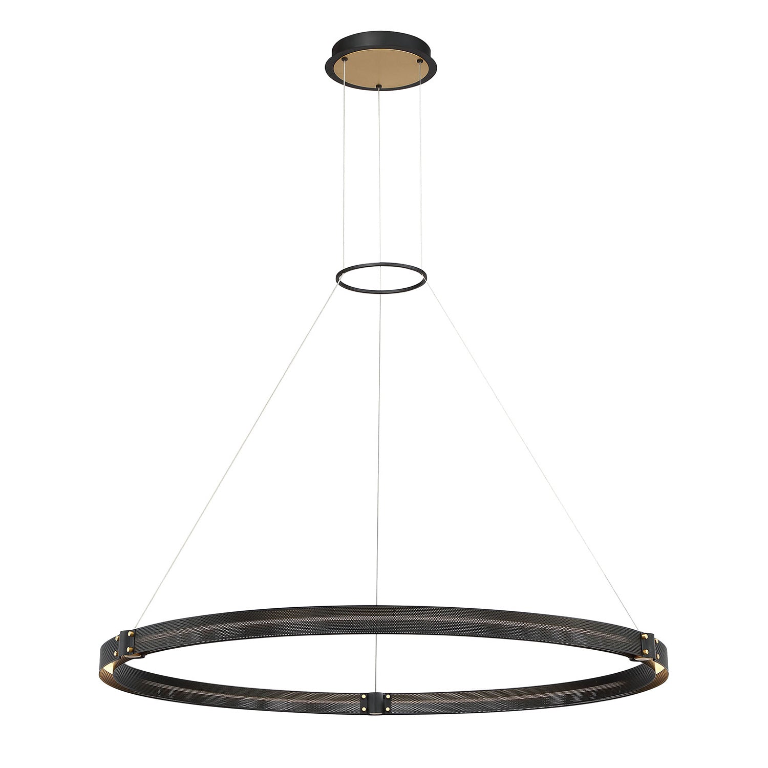 • Bold metal ring design with filigreed detailing, finished in black with brass accents, featuring integrated LED lighting that follows the circular contour for brilliant ambient illumination