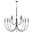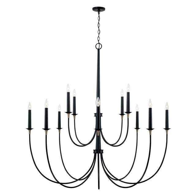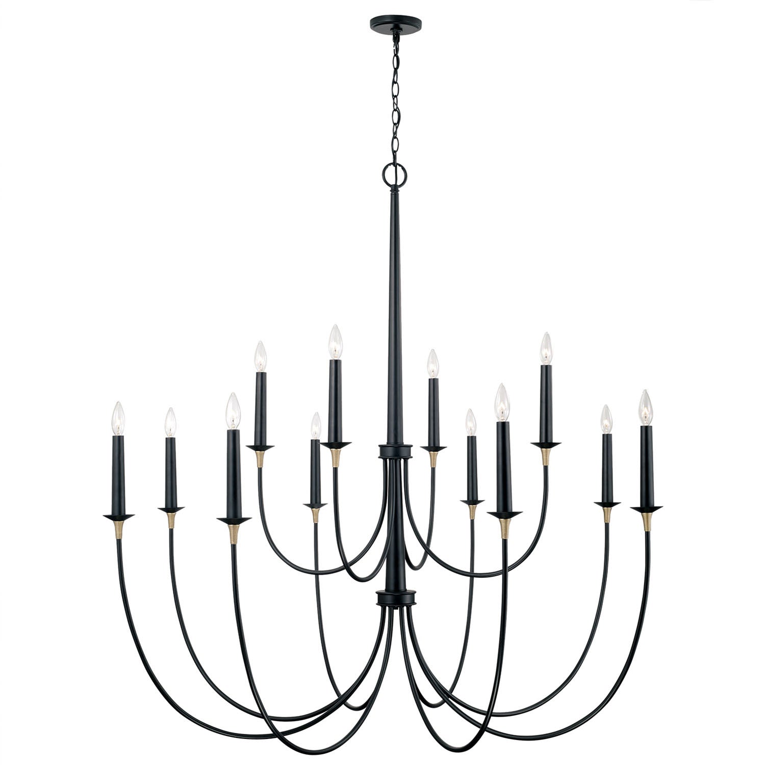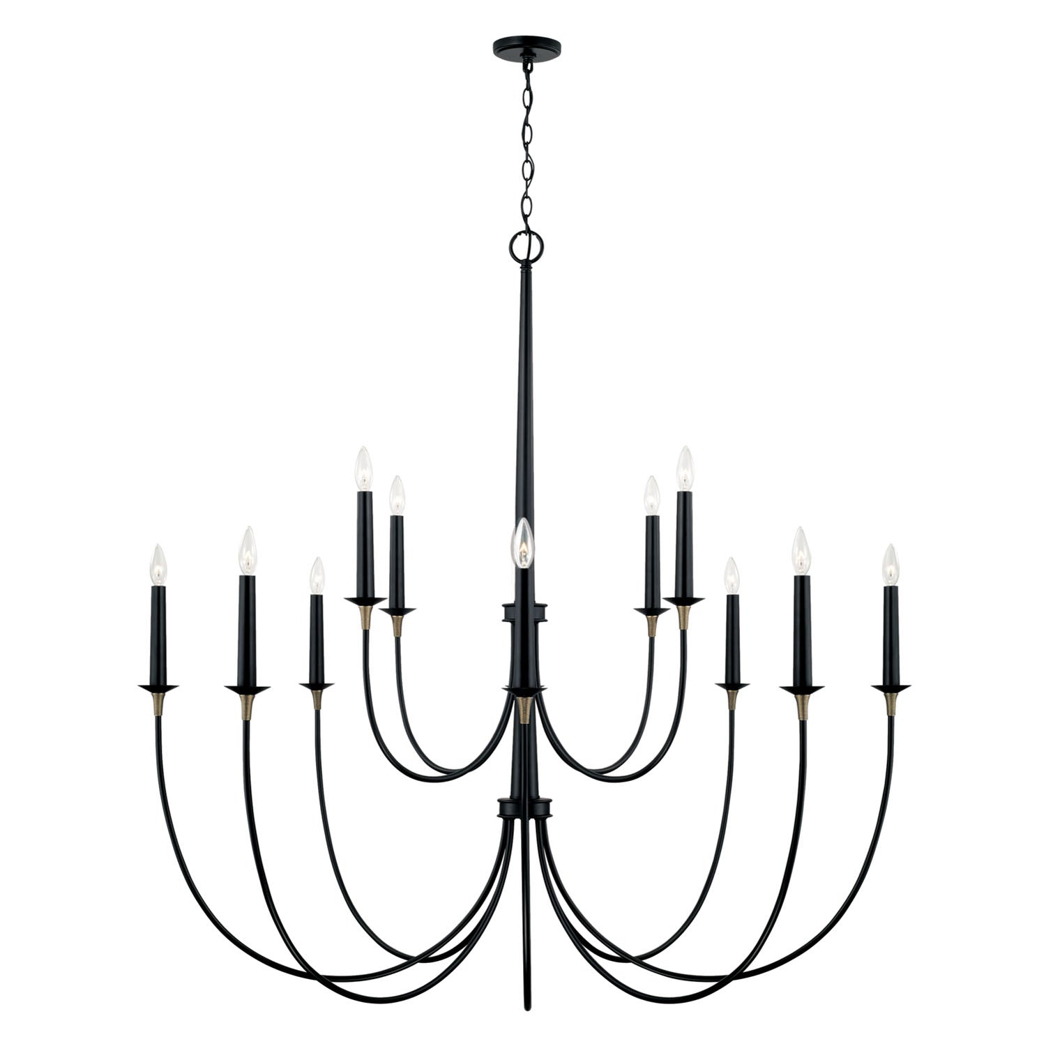 The Malin 12 Light Two-Tier 54" Chandelier brings sophisticated contrast to any space with its distinctive mixed-metal design. This thoughtfully crafted fixture features a sleek matte black frame with brass accents and twelve swooping arms arranged in two tiers that provide beautiful, abundant illumination perfect for large dining rooms, grand living areas, and foyers. The simple yet elegant candelabra silhouette creates striking ambient lighting where refined design meets functional lighting needs.