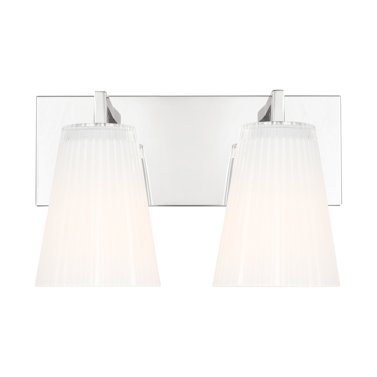 The Margot 2 Light Vanity features clear ribbed glass shades finished with a white interior that creates sophisticated illumination with soft layered glow and refined contemporary appeal. This elegant vanity fixture combines distinctive textural glass with enhanced luminous quality, showcasing two coordinated shades that provide balanced lighting distribution and excellent coverage for compact vanity areas. The structured framework delivers clean architectural lines while the ribbed glass creates subtle visual interest and optimal light diffusion, perfect for bathrooms, powder rooms, vanity areas, and spaces seeking refined vanity lighting with efficient proportions. The chrome finish brings polished metallic brilliance to the structured framework while ensuring reliable daily performance. With its damp-rated construction and thoughtfully compact proportions, this expertly crafted vanity fixture elevates any space with contemporary elegance and dependable functionality.