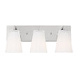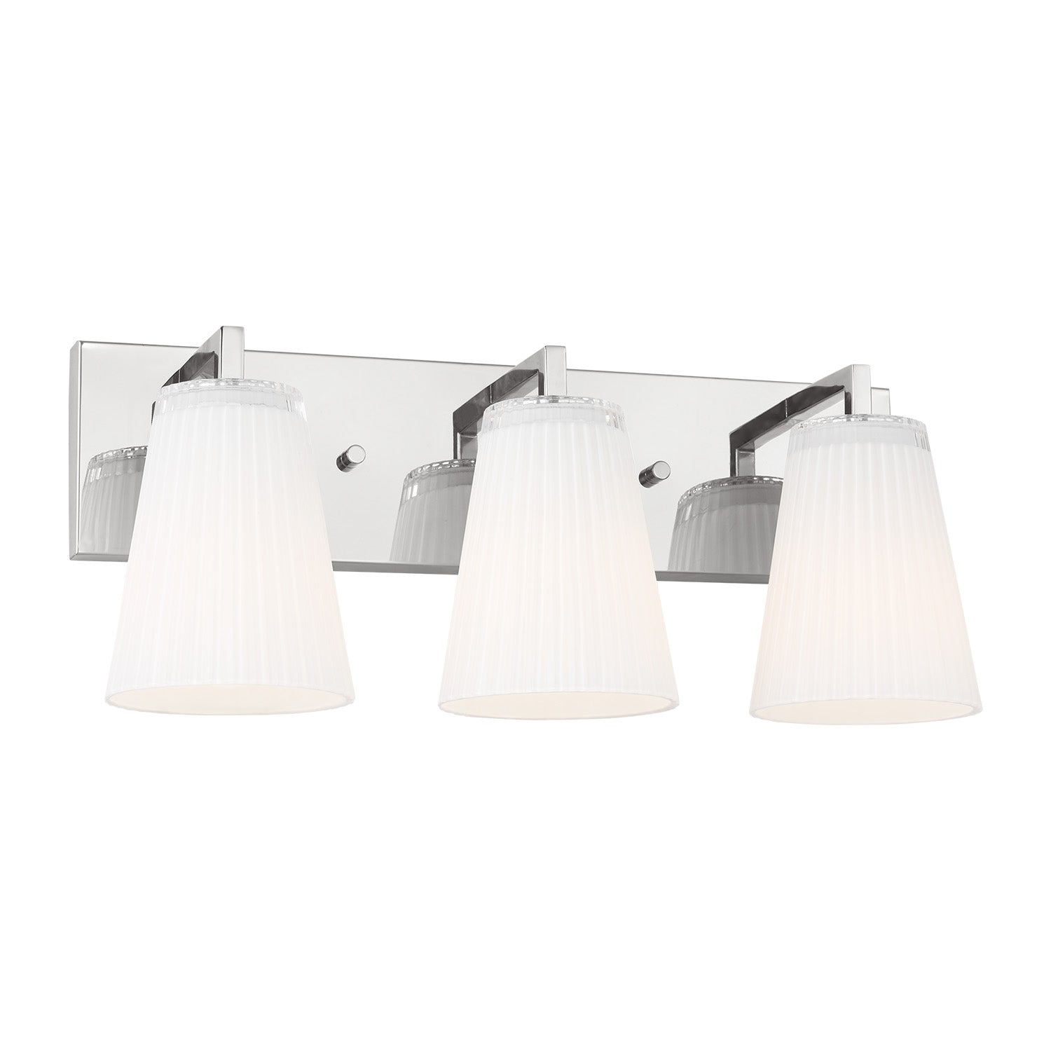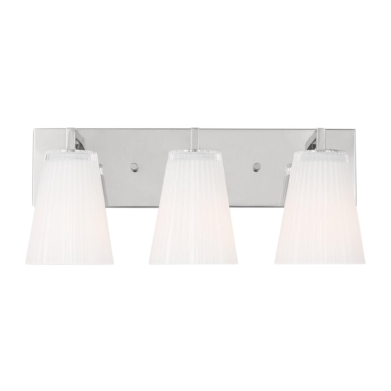 The Margot 3 Light Vanity features clear ribbed glass shades finished with a white interior that creates sophisticated illumination with soft layered glow and refined contemporary appeal. This elegant vanity fixture combines distinctive textural glass with enhanced luminous quality, showcasing three coordinated shades that provide balanced lighting distribution and excellent coverage for standard vanity areas. The structured framework delivers clean architectural lines while the ribbed glass creates subtle visual interest and optimal light diffusion, perfect for bathrooms, powder rooms, vanity areas, and spaces seeking refined vanity lighting with ideal proportions. The chrome finish brings polished metallic brilliance to the structured framework while ensuring reliable daily performance. With its damp-rated construction and thoughtfully scaled proportions, this expertly crafted vanity fixture elevates any space with contemporary elegance and dependable functionality.