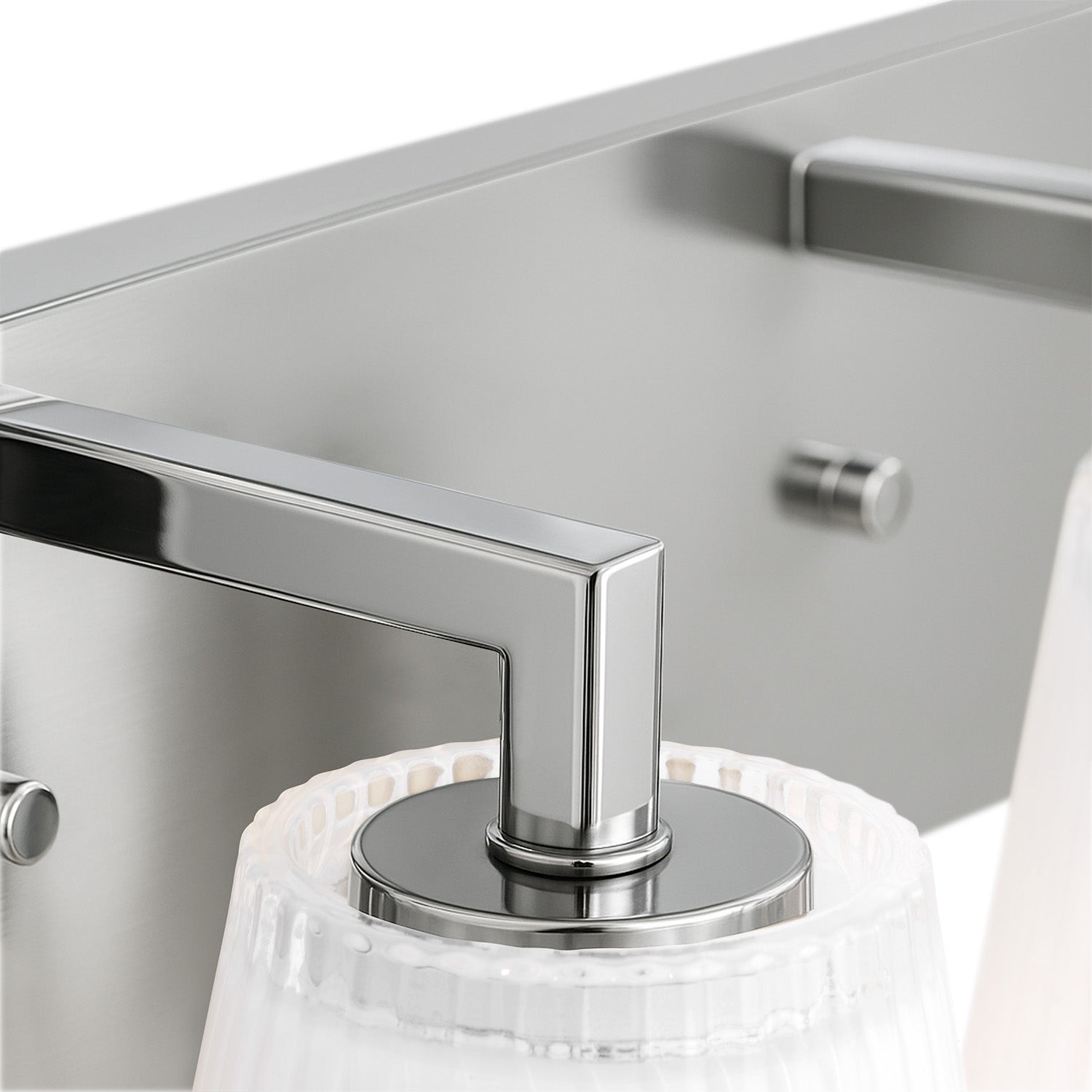 • Clear ribbed glass shades with white interior finish create sophisticated vanity illumination with a soft glow