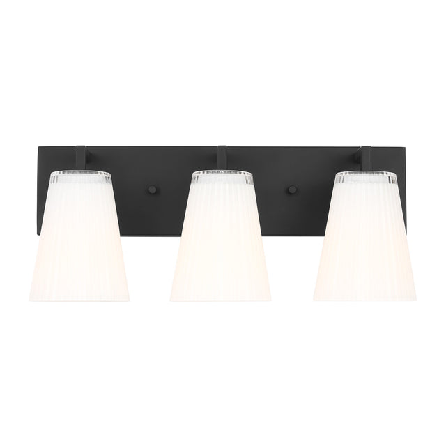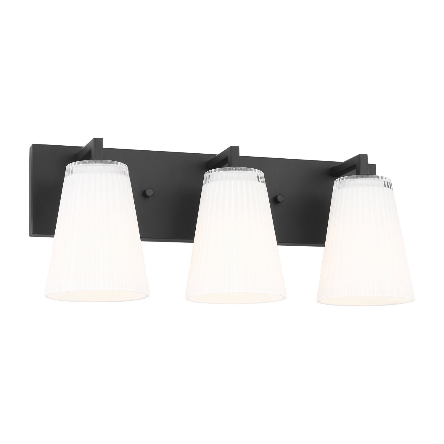 The Margot 3 Light Vanity features clear ribbed glass shades finished with a white interior that creates sophisticated illumination with soft layered glow and refined contemporary appeal. This elegant vanity fixture combines distinctive textural glass with enhanced luminous quality, showcasing three coordinated shades that provide balanced lighting distribution and excellent coverage for standard vanity areas. The structured framework delivers clean architectural lines while the ribbed glass creates subtle visual interest and optimal light diffusion, perfect for bathrooms, powder rooms, vanity areas, and spaces seeking refined vanity lighting with ideal proportions. The matte black finish creates sophisticated contrast against the structured framework while ensuring reliable daily performance. With its damp-rated construction and thoughtfully scaled proportions, this expertly crafted vanity fixture elevates any space with contemporary elegance and dependable functionality.
